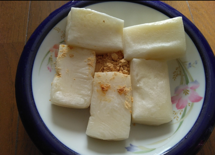 餅を焼いて砂糖を少量加えたきな粉につけて食べましたきな粉と砂糖と餅のシンプルな味ですが美味しかったです
