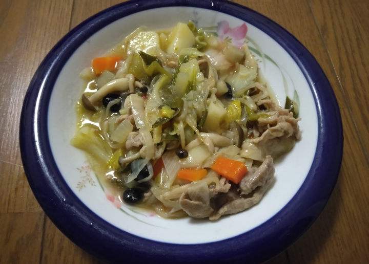 八宝菜を作りました具材は、豚肉細切れ、にんじん、玉ねぎ、じゃがいも、白菜、ごぼう、もやし、蒸し黒豆、しめじ、しょうがを使いました調味料は料理酒 大さじ1杯砂糖 小さじ1/2杯塩 小さじ1/3杯しょうゆ 大さじ1杯鶏ガラスープの素 小さじ1杯水 50ccを使いました水溶き片栗粉は片栗粉 大さじ1/2杯水 大さじ1杯で作りましたボウルに豚肉を入れて料理酒大さじ1/2杯、しょうゆ小さじ1杯、片栗粉小さじ1杯を入れて揉み込んで下味をつけましたフライパンに米油と細かく切ったしょうがを入れて熱したあと豚肉を入れて色が変わるまで中火で炒めました次に白菜の芯、にんじん、玉ねぎ、じゃがいも、ごぼう、しめじを加えてしんなりするまで炒めましたそこに白菜の葉、もやし、蒸し黒豆を加えて少し炒めました調味料を加えてしばらく煮たあと水溶き片栗粉を回し入れてとろみをつけ、ごま油を少量加えて香りをつけたら完成です豚肉の下味もしっかりついていて美味しく出来ました