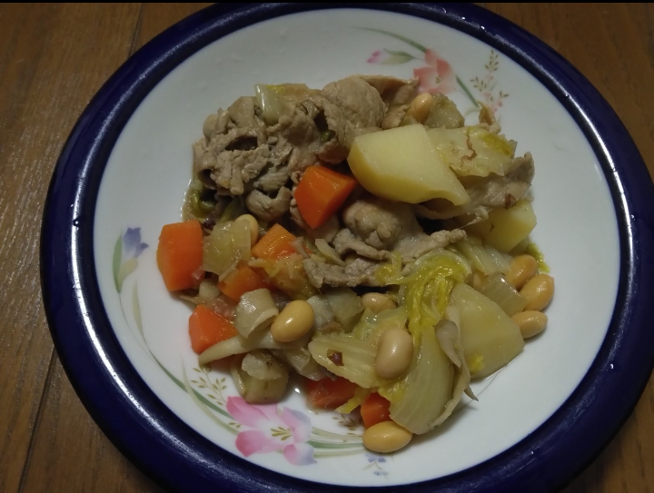 肉じゃがを作りました具材は豚肉の細切れ、じゃがいも、にんじん、玉ねぎ、マイタケ、白菜、ごぼう、蒸し大豆、唐辛子を使いました調味料は料理酒 大さじ1杯みりん 大さじ2杯砂糖 大さじ1杯しょうゆ 大さじ2と1/2杯を使いました鍋に米油を入れて熱し、豚肉を入れて肉の色が変わるまで中火で炒めましたそこに蒸し大豆以外の具材を加えて少し炒めたあと水200ccを加えて煮立たせて出てきた灰汁を取り除きました料理酒、みりん、砂糖を加えてかき混ぜて蓋をして約8分煮ましたしょうゆと蒸し大豆を加えてかき混ぜて蓋をして野菜が柔らかくなるまで煮たら完成ですちょうど良い甘辛さで美味しく出来ました