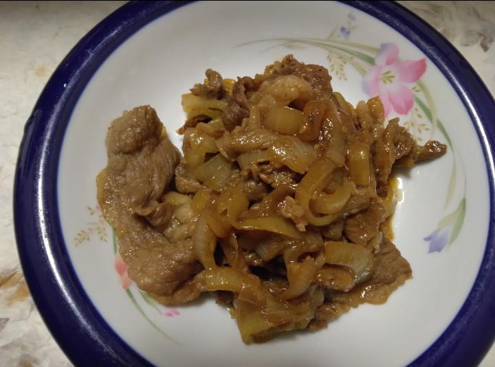 牛肉の切り落としと玉ねぎを焼肉のタレで炒めました生卵をかけて食べたら美味しかったです