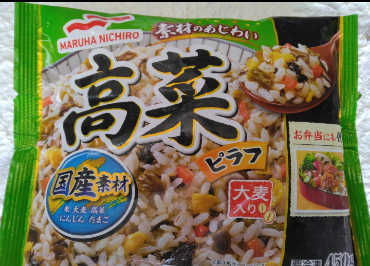 マルハニチロの冷凍高菜ピラフを買ってきました中身を丼に取り出しましたラップをしてレンジで温めました国産素材が使われていて炒飯と比べて油が少なめで美味しかったです[冷凍]マルハニチロ 高菜ピラフ 450g価格:499円(税込、送料別) (2025/3/18時点)