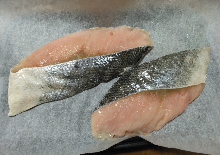 オーブントースターで塩鮭を焼きましたオーブントースター用のトレーにクッキングシートを敷いて塩鮭の切り身を並べましたオーブントースターで800wで8分焼きましたちょうど良い焼き加減で美味しく出来ました