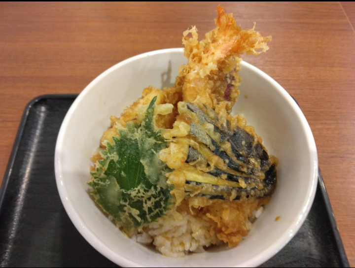イオンモールのフードコートにある天すけの天丼【竹】を食べました具材は海老2尾、ナス、大葉、さつまいも、れんこんの天ぷらがのっていました衣がサクサクで美味しかったです