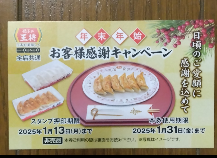 年末年始お客様感謝キャンペーンで税込500円でスタンプ1個押印されてスタンプ4個で餃子2人前以上注文すると1人前無料になるスタンプカードを頂きました餃子の焼き加減もちょうど良くエビチリもピリ辛で美味しかったです