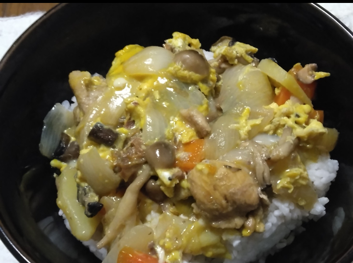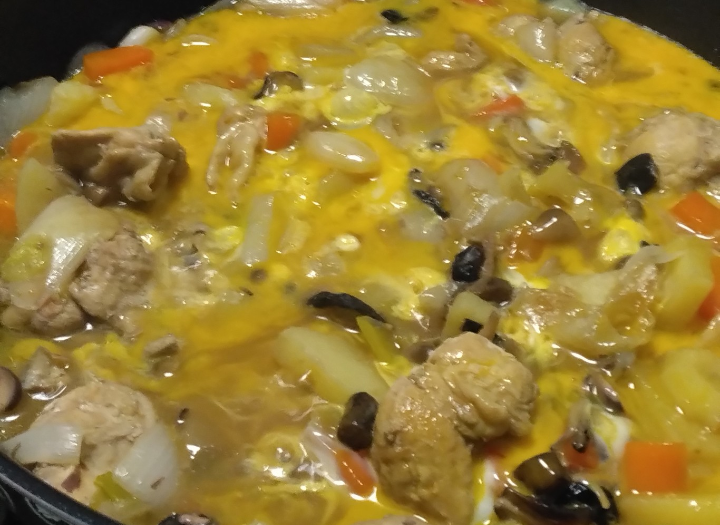 具材は鶏もも肉、にんじん、玉ねぎ、じゃがいも、長ネギ、干し椎茸、しめじ、ごぼう、蒸し黒豆を使いました