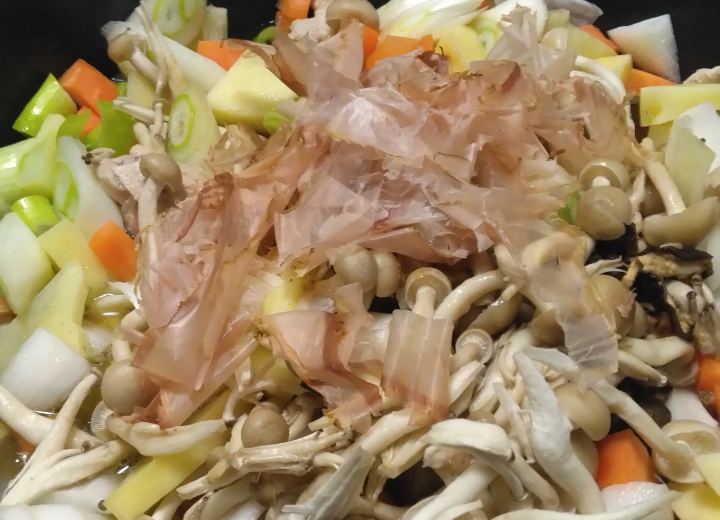 具材と調味料と鰹節を入れて野菜が柔らかくなるまで煮ました