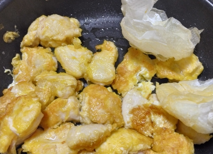 フライパンの余分な油をキッチンペーパーで拭き取りました