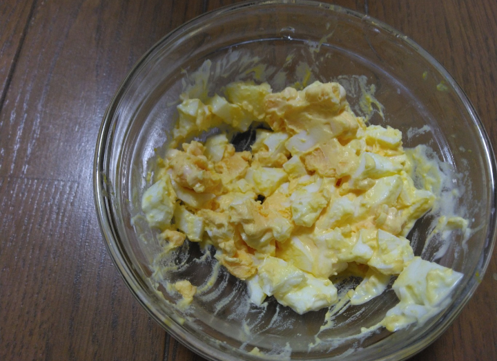 ゆで卵をフォークでつぶしてマヨネーズを加えてかき混ぜてタルタルソースを作りました