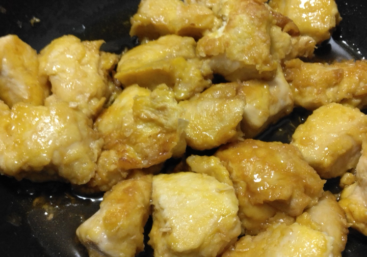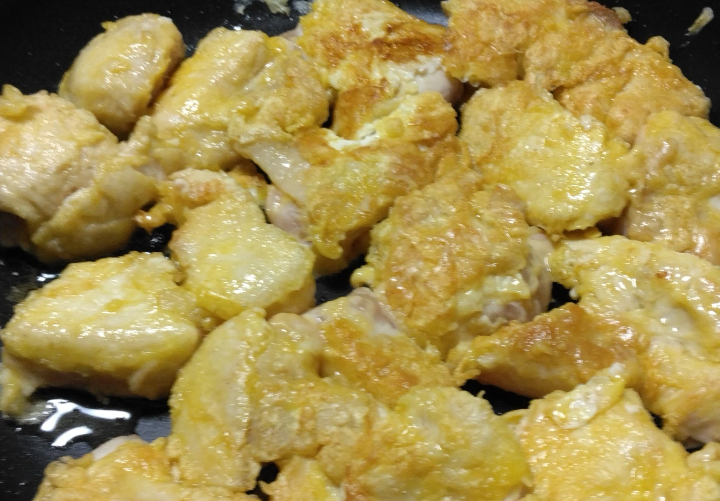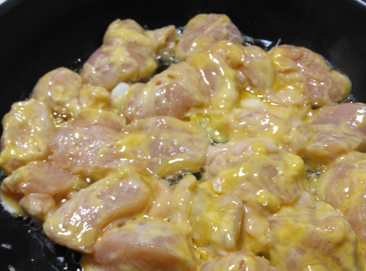 フライパンに油を入れて熱し、先ほどの鶏ムネ肉を入れて焼き色がつくまで中火で揚げ焼きにしました
