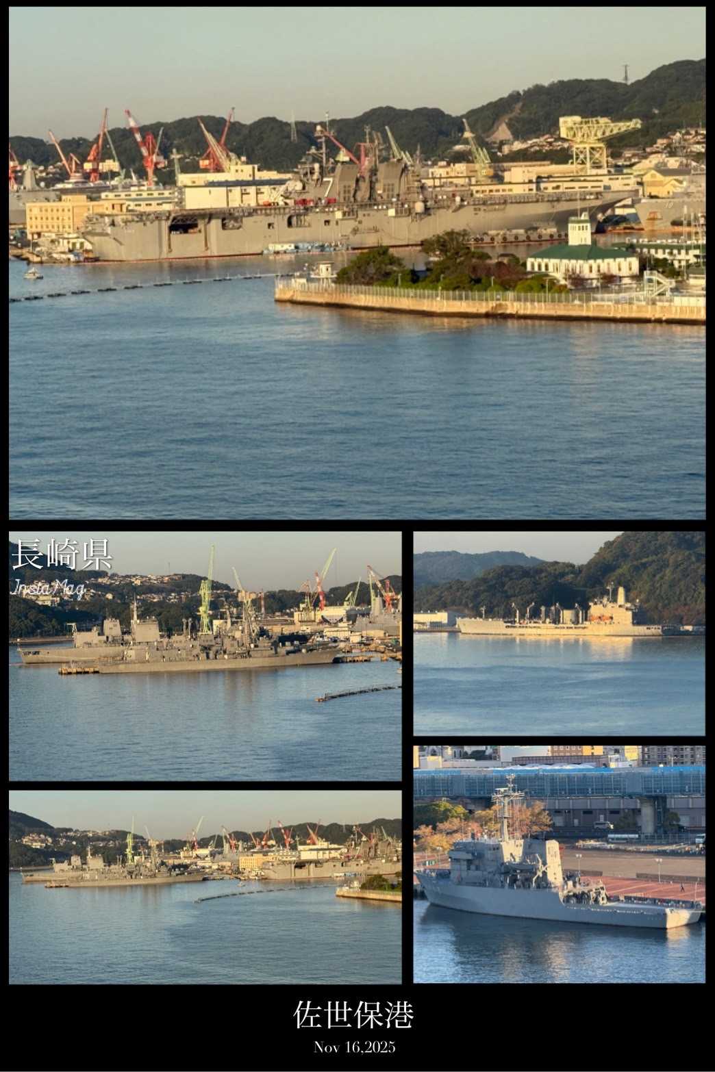 佐世保港到着!客室からは軍艦が多数見えます。さすが佐世保!レンタカーで移動したらドックに入港している飛鳥Ⅱも発見!