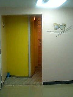 トイレの入口には、階ごとに使ったタイル、アルミバーなどで、階表示のオブジェを創った。