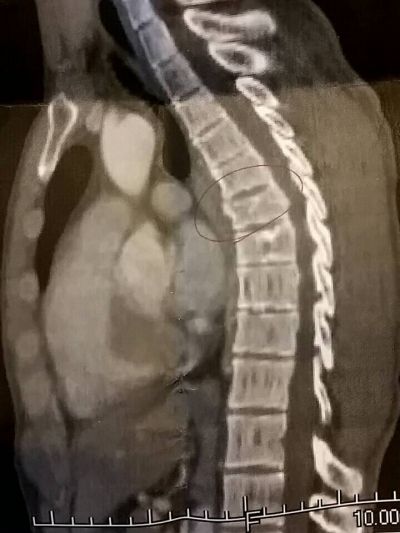 どこの骨が折れたかと言いますと、第7胸椎圧迫骨折と、首の付け根?の骨が欠けております(T^T)早く復帰したいですが、こればっかりは日にち薬のようです(´;ω;`)しっかり治してまた頑張りたいです!!○で囲んだ骨が傷んでいるみたいです!おかげで息をすると肺が大きくなるので息をするだけで痛みます(^_^;)割れてるのが首の付け根辺りの骨らしいです(^_^;)