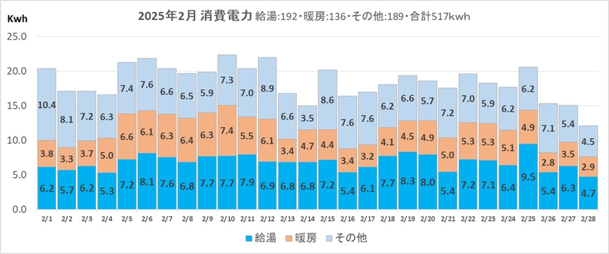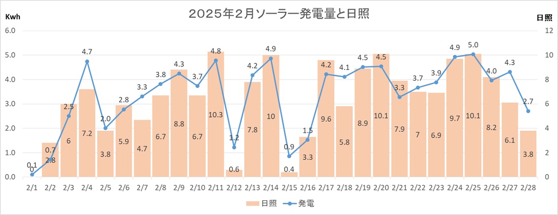 暖かくなりますとエアコンは不用になり、水温が上がりエコキュートの消費電力も減少します、2/28の購入電力は12.1kwh・・・、春になれば日々の購入電力はもっと少なくなるでしょう。