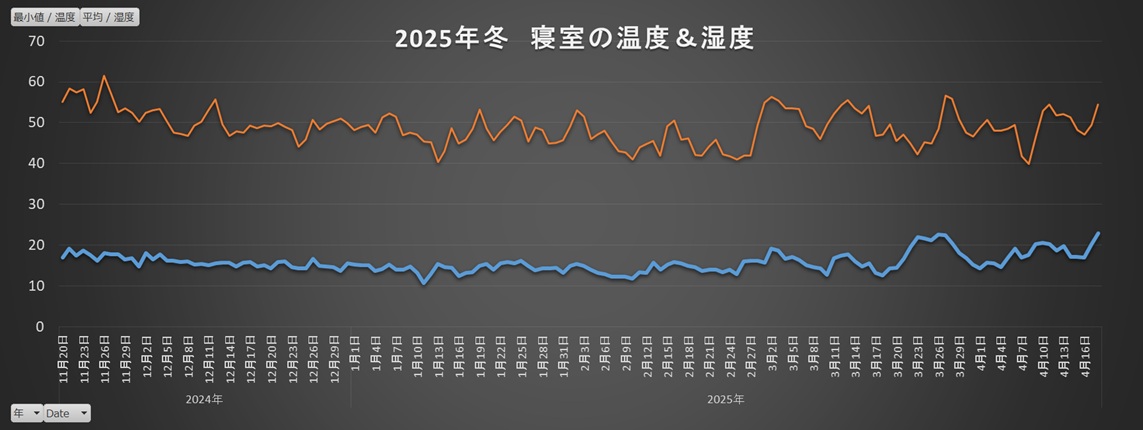 この冬リビングの室温は21~22℃を保つことができましたが、加湿器など使用していない部屋の湿度は30~40%になっています、ただエアコンは24時間運転していますので何時起きても暖房のない寝室からリビングに移動すれば温かく快適な冬の朝を過ごすことができました。