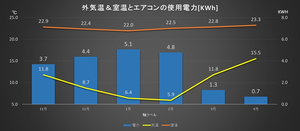 11月から南北2台のエアコンを20℃設定で運転しました、1月19日に南側1台にして21℃設定で4月まで運転しました、グラフからエアコン2台運転は余分な電力を消費していることが分かりました