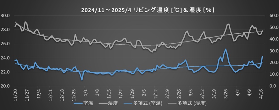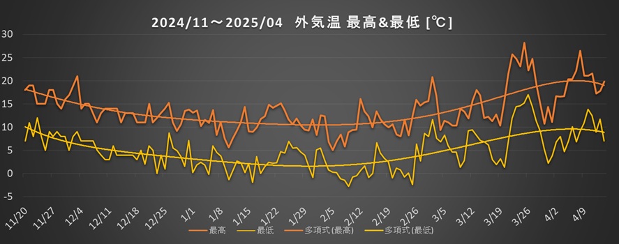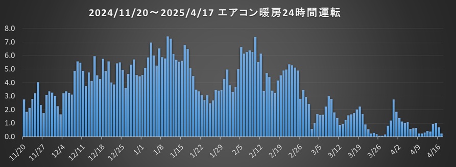 エアコンを運転したのは2024年11月20日~2025年4月18日、149日でした、使用した電力は519Kwh電気代14,000円になりました、電気代単価は27円/Kwh、電気代を灯油に換算しますと14,000円÷2,200円/缶で 約6.5缶弱になりました、石油ストーブと違って24時間運転ですからリビングは寝ている間も暖かいです