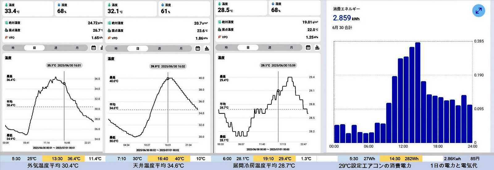 グラフは左から外気温・天井温度・リビングの温度・エアコンの使用電力です