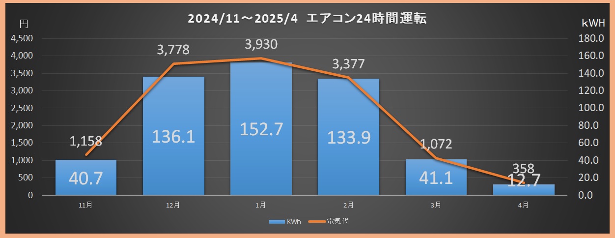 2025年冬暖房費用と環境のまとめですエアコンを運転したのは2024年11月20日~2025年4月18日、149日でした、使用した電力は519Kwh電気代14,000円になりました、電気代単価は27円/Kwh、電気代を灯油に換算しますと14,000円÷2,200円/缶で 約6.5缶弱になりました、石油ストーブと違って24時間運転ですからリビングは寝ている間も暖かいですエアコン24時間運転の使用電力と電気代149日間のエアコンのコン使用電力1月下旬は暖かい日が続きましたからエアコンの使用電力も少ないです今年の冬、外気温の変化3月下旬は暖かい日が続きエアコンはほぼ停止状態でしたリビングの温度と湿度湿度が30%蚊ら40%とちょっと低いです寝室の温度と湿度、暖房はしません暖房なしで枕元に置いた温度計は15℃前後です最低で10℃を記録しています外気温・室温とエアコンの使用電力の平均「例:1月 5.1kwh×27円」138円/日です11月から南北2台のエアコンを20℃設定で運転しました、1月19日に南側1台にして21℃設定で4月まで運転しました、グラフからエアコン2台運転は余分な電力を消費していることが分かりました天井の断熱材の追加施工、1月2日に一重だった天井の断熱材を二重にしましたが、この効果はグラフからは読み取れなさそうでした天井に断熱材を敷き詰める | katuragi2ndのブログ - 楽天ブログ暖房の適温、調べますと冬の室内の快適な温度は一般的に18℃以上が推奨されています、特に高齢者や赤ちゃんは体温の調節が難しいので20℃前後の温度が理想的です。また室内の湿度も重要で、40%~60%が快適とされています。この冬リビングの室温は21~22℃を保つことができましたが、加湿器など使用していない部屋の湿度は30~40%になっています、ただエアコンは24時間運転していますので何時起きても暖房のない寝室からリビングに移動すれば温かく快適な冬の朝を過ごすことができました。電力計はTapo P110M家庭内電気器具の消費電力を知る | katuragi2ndのブログ - 楽天ブログ温湿度はSwitchBot 温湿度計|温度・湿度を適切に管理 – SwitchBot (スイッチボット)