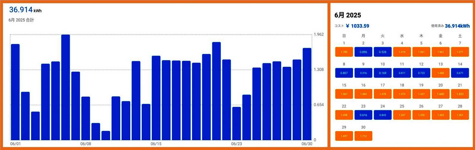 2025年6月のソーラー発電実績です6月はお天気悪かったですね、発電量は少ないです発電量が少ないのはお天気のせいにしていたのですが、収獲が済んだ梅の木の枝が予想以上に伸びて、垂直に設置し日当たりの悪いパネルは梅の木の影になっていました月末に剪定済です6月は日照時間ほぼ0の日が結構ありました日照時間は6月としては平年以上ありました発電量過去最低の原因はやっぱり梅の木でした今月は梅雨明けした6月30日の気温と室温冷房の電気代を調べてみますグラフは左から外気温・天井温度・リビングの温度・エアコンの使用電力です平均気温は30.4℃・天井裏は平均34.6℃、最高温度40℃・エアコンの効いた18畳のリビングは平均28.7℃ちょっと高いですが慣れれば暑くはないです、早朝と午後室温は0.6℃ほど上下します、暑いときは扇風機併用します、エアコン設定温度は29℃ですが28℃に下げると早朝寒くなりますこの日の連続運転のエアコンの使用電力は最低27Wh・最高282Wh1日分は2.86kwhでした、今単価は30円ですから電気代は85円になります、6畳用エアコンで18畳のリビングの冷房は電力消費のグラフから見て3割程度の軽い運転になっています、18畳用の高いエアコンは必要ないのです7月からエアコンの設定を自動運転に切り替えました、説明書では自動運転は冷房24℃設定になるそうです必要に合わせて6℃まで追加できるらしく自動運転+5℃(29℃)にしてあります、結果はまた次回で・・・。