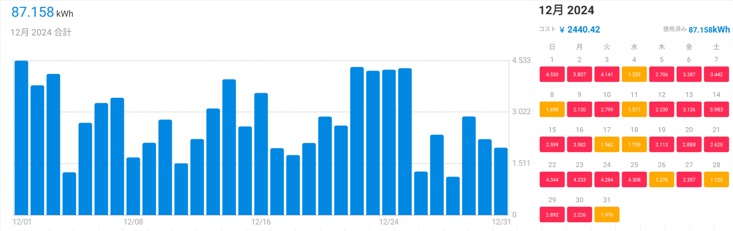 垂直に設置したソーラーパネル8枚は当初から直接並列接続していましたが、直結は良くないらしいです、12月9日に逆流防止ダイオードを追加しました、パネル相互間の干渉がなくなり発電量のアップを確認しました、インバータが1kw MAXですからマイコン制御でパネル2枚を切り離し最大700Wに押さえています2024年12月も発電量は87Kwhでした12月はお天気よかったです、右のカレンダー赤いです日照時間と発電量電力会社提供のデーターから日照時間が消えたので気象台のデーターを持ってきました累計発電量は5,312Kwhになりました話は変わって12月分のエコキュートの電気代です、お湯の使用料は300㍑/日程度12月の電気代は14,250円、購入電力は514kwh平均単価は約28円になりました・エコキュートの電気代は深夜電力で147Kwh×約25円/kwh=3,670円・エアコン2台の使用電力高いと思っていたが136Kwh×28円=3,800円・テレビは1日中!夜もついています 65インチ38kwh×28円=1,060円・その他 居間 寝室 台所 風呂 トイレ等・・約150kwh×28円=4,200円 合計12,730円少し足りません・・・ソーラー発電の電力計算が難しいのです電気代は請求で支払う額でなく日々のデーターを集計して月末でを1ヶ月分としています。