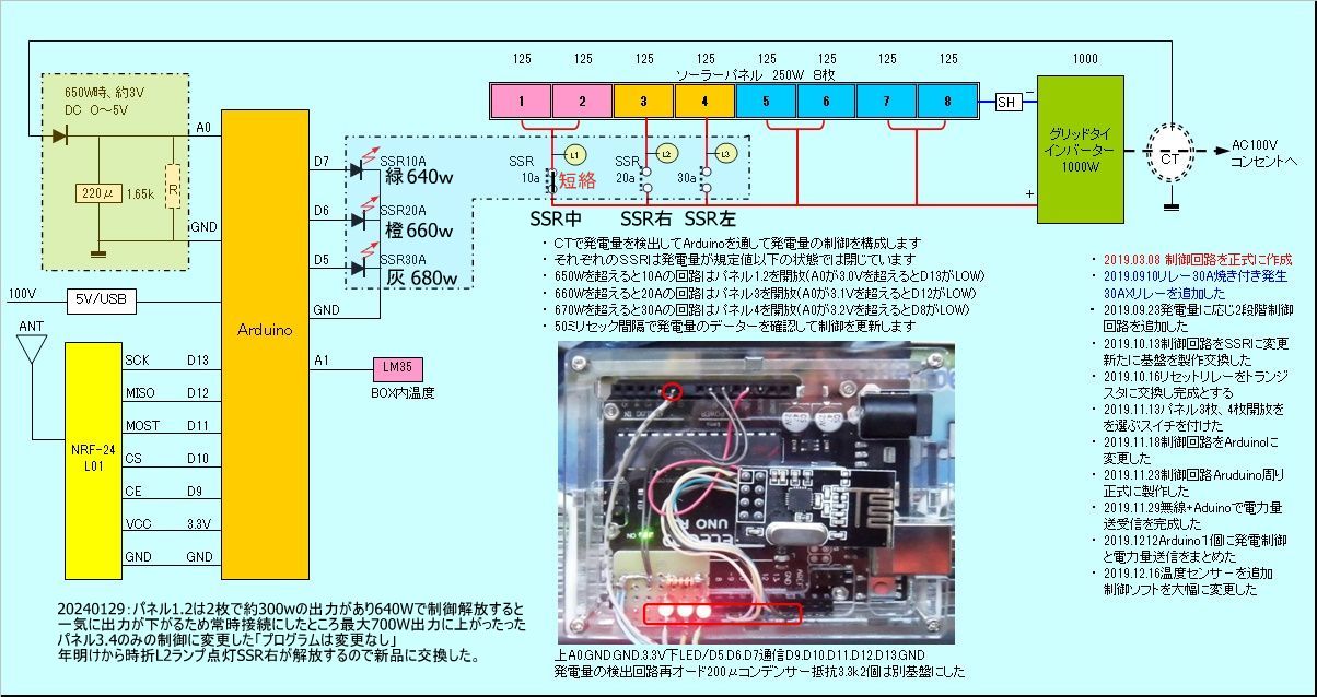 2025年10月のソーラー発電実績ですお天気がいいと「既設+発電2」で5Kwhを確保できそうですグラフ下は写真の既設発電所、上は発電2倉庫の屋根日当たりが悪く徐々に発電量が落ちています月別発電量3年分です最近お天気のいい日に冷却不足発熱のためインバーターが停止します、ファンを風量の多いものに替えたり内部にファンを追加してみましたが効果は?インバーターを青い収納箱から出して直接外気に当てることで冷却効果はアップしたようです発電所を拡張しました「屋根を新調・外壁も強化・前面アクリルカバー」発電所内部は左上からTapoP110Mこれはスマホに発電量を送ってきます、1KWインバーター2018年から動いています、冷却ファンは12V用を直列に接続吸気と排気4個、下はArduino発電量制御と温度・湿度・発電量を無線で送信し専用のロガーで記録しています、右はファン制御のリレーその下は出力制御パネル切離リレー、NFBは安全ブレーカ30A過電流で遮断できます冷却ファンはソーラーパネルに直結でしたから、夜明から日没まで動いていますし、発電しない早朝夕暮れ時は負荷のないパネルの出力は30Vを超えファンの定格を超えます、雨の日もファンは動作しますので収納箱内の湿度も上がりよくないことばかりでした発電出力制御用のArduinonにプログラムを1行追加して設定値を超えるとソリッドステートリレーでファンを起動する //発電出力制御 if (packet.data0>650){digitalWrite(7,LOW);}else{digitalWrite(7,HIGH);//650W } delay(50); ソーラーパネル切り離し1段 if (packet.data0>660){digitalWrite(6,LOW);}else{digitalWrite(6,HIGH);//660W } delay(50); ソーラーパネル切り離し2段 if (packet.data0>150){digitalWrite(5,HIGH);}else{digitalWrite(5,LOW);//150W FanOn } delay(50); } 発電量150wを超えたらファン起動解決しました、忘れないようにここに書いておきます以前の収納状況はこんな感じでした①左下から吸入右下に排気 2018/05 ②左から吸入右に排気 2019/10~2025/10①インバーター収納箱が雨ざらしになるので下から吸気・下に排気これは収納箱内でショートカットが起きて冷却効果が良くなかったようです②左から吸気右に排気これは雨が降っても大丈夫なように屋根を付けて左右にカバーも付いてこれで約6年運用してきました、左右はプラダンです最近劣化で触るとボロボロ崩れ改修時期でした。現状、仮設状態で配線の整理も済んでいませんが様子を見ながら改良していきます冷却ファンの動作時間の減少・・・、寿命が延び交換回数が減る!期待しています。