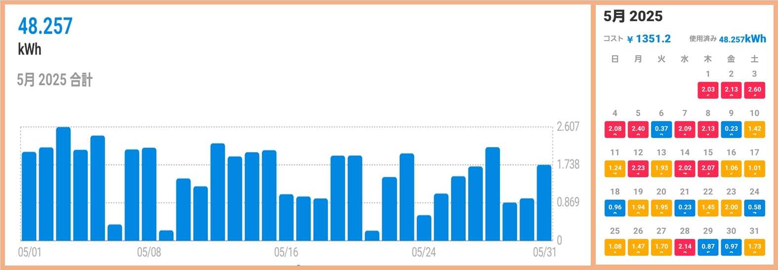 2025年5月のソーラー発電実績今月は48kwhでした垂直に設置したソーラーパネルの発電量はこの時期、太陽高度が低く来月は梅雨!最悪ですその中でも最高記録は5月3日が2.6kwh/日でした発電量と日照時間・・・結構お天気悪かったのですね過去の発電実績から見ても少ない・・・、6月は恐怖の梅雨です今回はエコキュートの使用電力です、契約は「電化でナイト・セレクト22」です深夜電力の契約料金は14.59円/kwhです、再エネ賦課金等も入れて18円/kwh程度になります季節ごとの給湯費用はこんな感じです 寒い冬の使用電力は平均 6 kwh✕18円=108円/日 使用湯量300㍑平均 暑い夏の使用電力は平均 1.5kwh✕18円=27円/日 使用湯量200㍑平均年間給湯費用はやすいかも知れません 2023年の使用電力は1,280kwh✕18円=23,040円/年 使用湯量94.2㎥ 2024年の使用電力は1,308kwh✕18円=23,540円/年 使用湯量97.3㎥年間の購入電力量と電気料金 2023年 購入電力は4,775kwh 電気料金は121,980円 単価25.55円/kwh 2024年 購入電力は5,030kwh 電気料金は132,430円 単価26.32円/kwh2年分の電気代から 給湯 46,580円÷購入 254,410円=18.3% 夫婦ふたりの年間給湯費用は購入電力全体の18.3%になることが分かりました 1日当たりの湯沸かし費用は・・・、46,580円÷2年(730日)=63.8円/日オール電化で湯沸かし63.8円/日、年金暮らしの私共に優しく安全な契約だと感謝しています。
