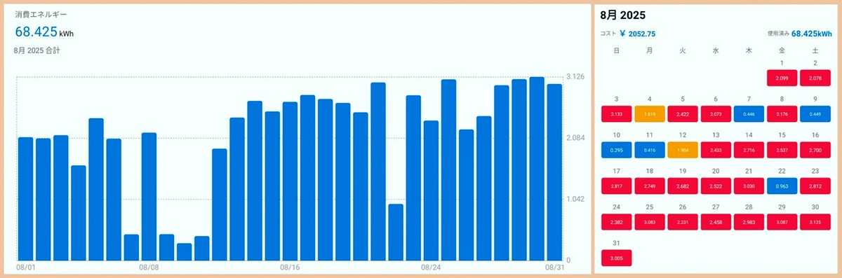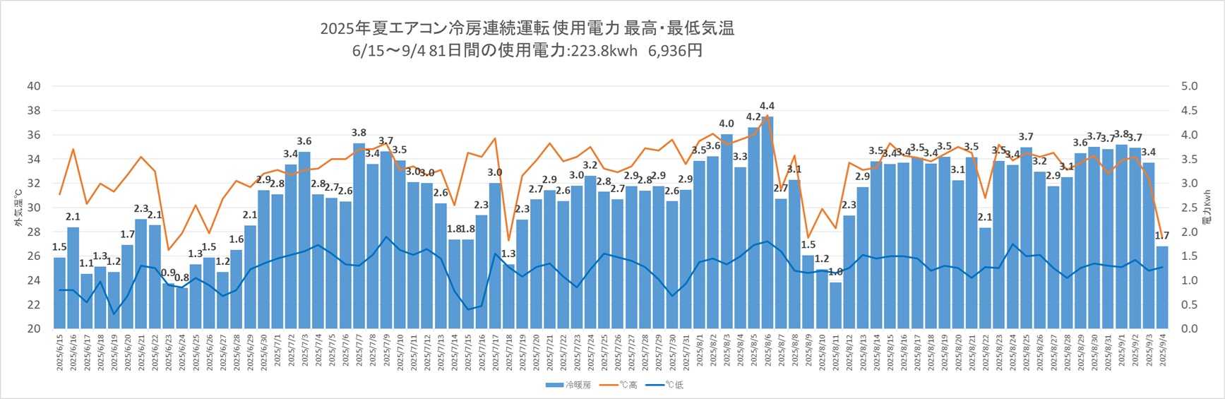 史上最速6月に梅雨明けして暑い日が続いています、9月になってもエアコンなしでは生きてゆけません、秋から政府の補助がなくなる、と・・・いうのに今年の夏のリビングエアコン2台の冷房運転は6月15日にスタートしました、当初温度設定・自動運転・1台運転など試しましたが、設定温度は30℃・風量自動で24時間運転が続いています6月15日~9月4日までのエアコンの使用電力と電気代です(単価31円/kwh)暑い時期の使用電力は3~3.5kwh平均です7月分のリビングエアコンの電気代です8月分のリビングエアコンの電気代ですこちらは7.5畳の寝室エアコンの電気代です7.5畳の寝室エアコンは22:00前後~07:00まで約9時間の運転です7月は12kwh 374円・8月は13.6kwh 421円になっています8月31日の寝室エアコンの稼働状況です、設定は28℃・風向きは横・風量自動想像より消費電力があまりにも少ないので何度も検証してみましたが間違いなさそうです8月31日の寝室の温度変化です、上のエアコン運転に温度が同期していますエアコン運転中は室温28度前後で安定しています、15:30ごろ最高温度31.2度を記録しています。
