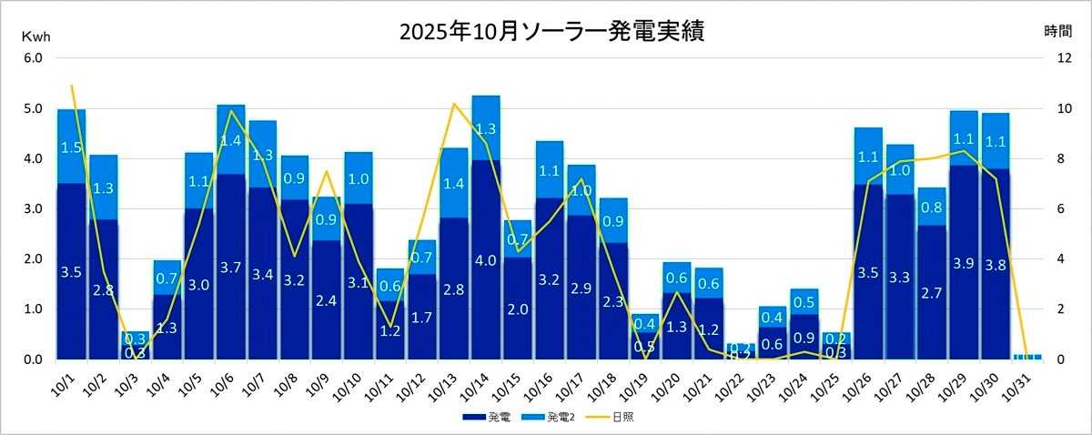 2024年10月のソーラー発電実績です9月末にソーラー発電所に取り付けたスマートプラグTapoP110MからWiFiで発電量を送ってきます10月はお天気悪く発電量は50kwhでしたスマホ画面のスクリーンショットです、右はカレンダーに発電量が色分けして表示されます1kwh以下は青(雨)・2kwh以上は赤(晴)1~2kwhはオレンジ(曇り)でしょう2024年10月日照と発電量日照時間は過去最低の85時間でした日照不足で野菜も育ちが悪いのでしょう、キュウリが2本で200円小さなキャベツが300円と、物価高に悪天候が追い打ちをかけている今日この頃です。