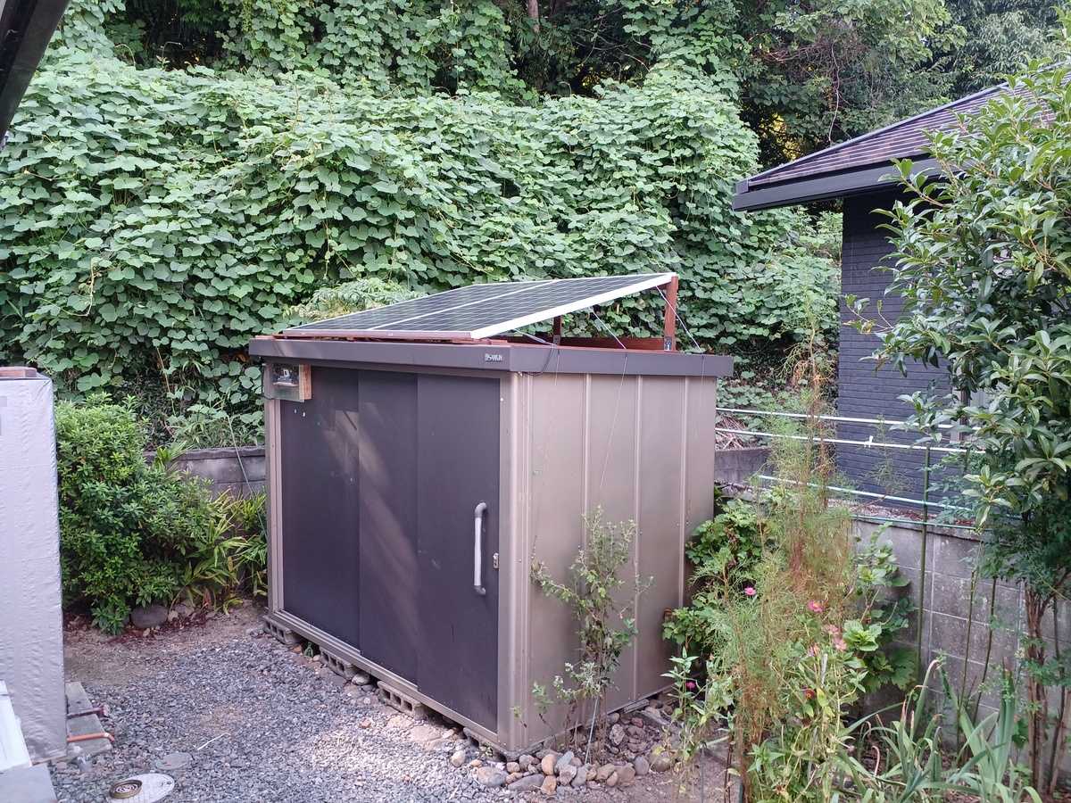 倉庫の屋根に置いたソーラー発電所は9月9日にインバーターの場所が決まり完成しました締め切った倉庫は夏40℃を超えます、この中で発熱するインバーターは冷却ファンがあっても50℃を超えることがわかりました、倉庫内に設置を計画していましたが無理なようです、倉庫の外にいい場所が見つかりました倉庫の左端の10cmほど出っ張った軒先の下の隙間、奥行きが8cmあるのです写真はよく晴れた9月9日15:35です向こうの山の木漏れ日が少しだけ、14:30には発電停止です奥行き8cmの棚をかけて右側に壁を作ればインバーターのお部屋が完成です横の有効スペースは扉を全開した状態で43cmありました、棚の幅は30cm両側に6cmの通気スペースをとって左から吸気、右が排気になりますちょっと大きいカバーは左と上は倉庫との隙間に3cmほど差し込みます、左と下は長くなっていますので風雨対策も万全です、翌日9月10日の豪雨?でも浸水することはありませんでした8cmファンを奥行きピッタリの棚に両面テープで張り付けますインバーター本体は下から持ちあげて押し込み棚の上にあるガイドに置いてあります、冷却ファンは12Vを2個直列にしてパネルに直結してあります、発電中の電圧は25Vに安定していますが、日の出・日の入り時に短時間30V近くまでアップします、運転中の最高温度は48℃を記録していますインバーター仕様は600W、入力は実測で25V-12A=300Wこの時の発電量は約260Wでした9月の発電量1日分と今日までの実績ですお天気が良ければ1.5kwh/日はいけそうです、9月上旬12.5日で15.4kwhの実績ですから30kwh/月は期待できそうです・・・が、秋から冬にかけ日当たりは悪くなります・・・残念。