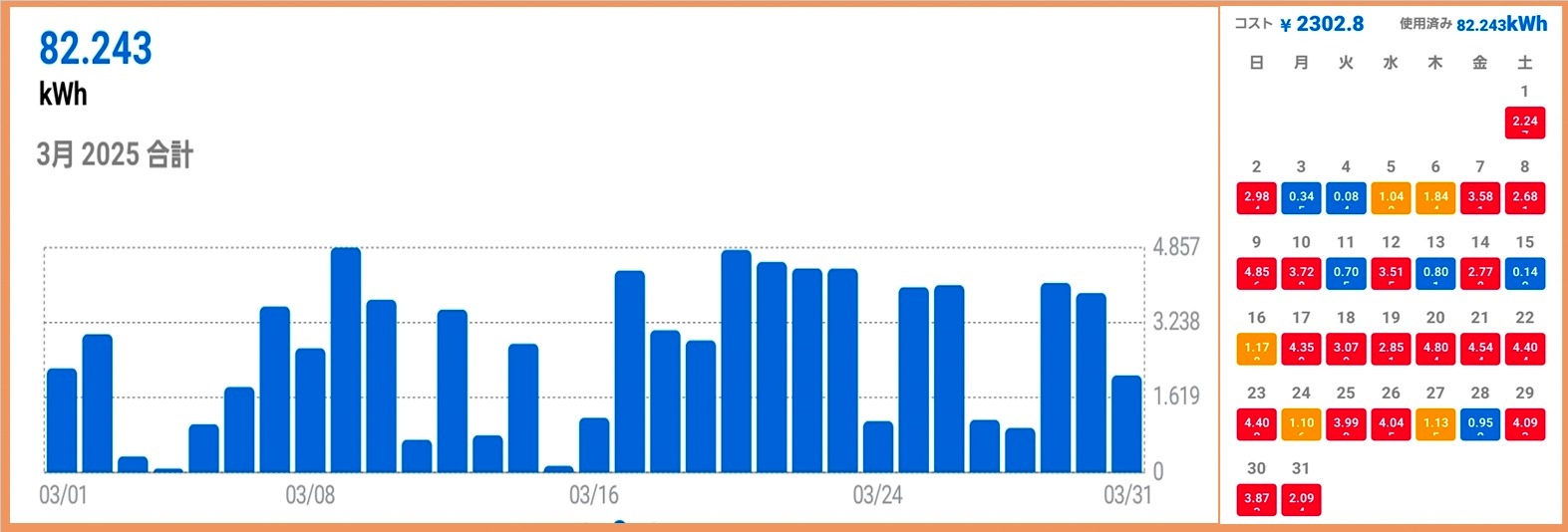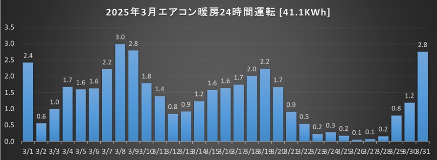 2025年3月のエアコン暖房運転の状況ですリビングののエアコン南北2台ありますが南側のみを21℃設定で運転です、3月26.27日とても暖かい日にエアコンは起動しませんでしたエアコンの消費電力3月分は41.4kwhでした3月分の電気料金単価は国の補助もあり昼間・深夜・休日・再エネ賦課金も含め26.1円になりました3月の暖房費用は・・・26.1円/kwh×41.4kwh×=1,080円灯油1缶分を切りましたリビングの温度記録です気温の変化地域の気象台の記録ですとても暖かだった3月27日のエアコン運転状況この日は1日のエアコン消費電力は26.1円×0.074kwh=1.93円・・・・2円/日余談ですが3月27日のテレビの視聴状況1日の消費電力は1.28kwhでした・・・・33円/日REGZA 65M540Xです、このテレビはリモコンで停止した状態の消費電力は約20Wあります、メーカーに問い合わせましたがネットワーク接続などのオプションを除外すれば待機電力を減らすことは出来るらしいです3月分のテレビの消費電力ですテレビ3月分の消費電力は37.5kwh・・・・・約980円/月以前紹介しました暮れに購入した冷蔵庫の3月分の消費電力が26.8kwhでした・・・約700円/月もうひとつエコキュートの消費電力は155.6kwh・・・・約4,060円/月3月の購入電力は447.6kwhで11,620円になりました、4月から国の補助もなくなりますが暖かくなり暖房も終わりエコキュートの使用電力も下がりますから極端に電気代が高くなることはなさそうです。