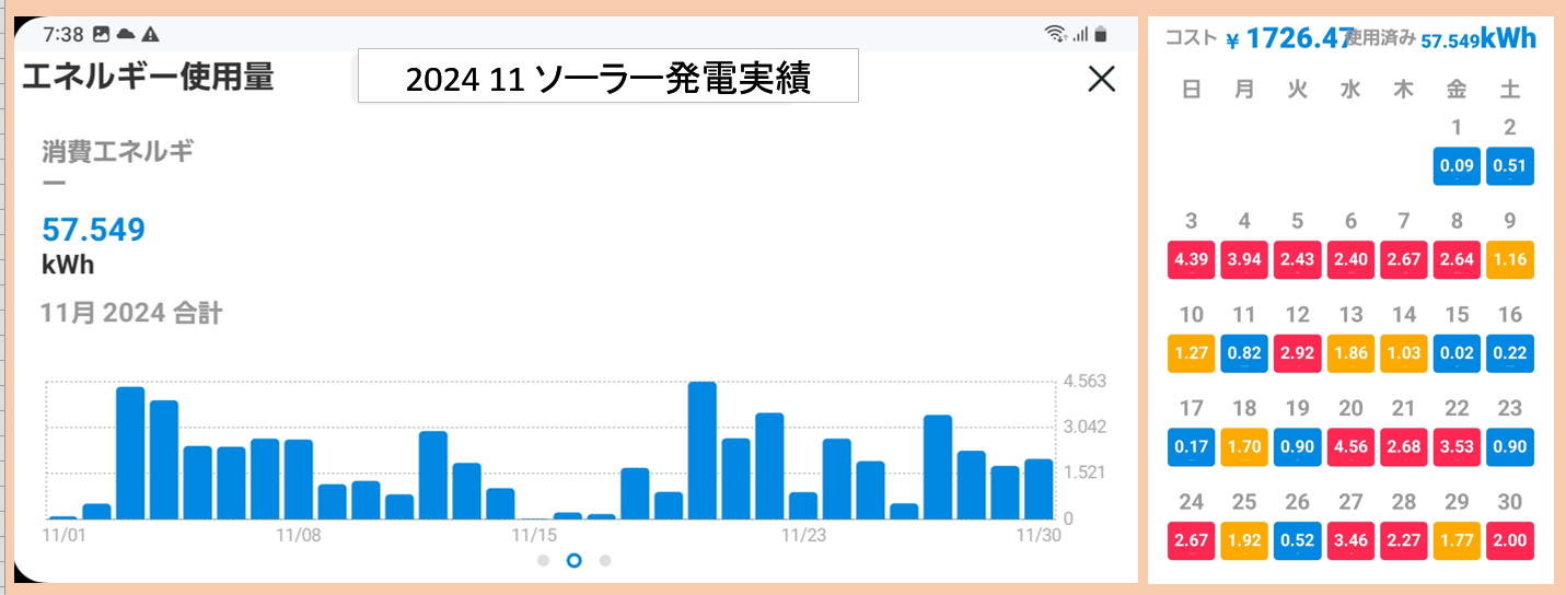 2024年11月のソーラー発電実績です今月もお天気が悪く発電量は57.5kwhでした晴と認知されたのは14日・くもりは7日・雨9日でした。この時期天気がいいと4Kwhを超えるのですが2日だけでしたこの季節の月間発電量は先月に続き114時間と過去最低なっています10月・11月と日照時間は過去最低ですから野菜も出来が悪いのでしょう、レタスにキャベツ・キュウリにブロッコリ高いです。我が家の菜園では季節外れのキュウリが3本収穫できそうです小指程度のものがありますが、もう育たないでしょう。