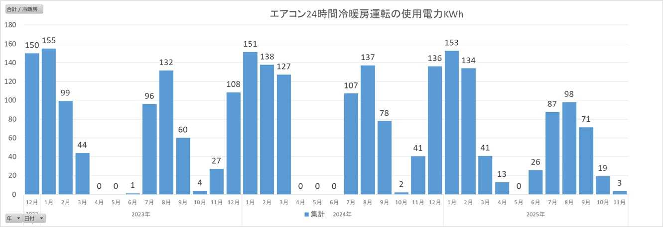 2024年12月に天井断熱材(グラスウール50mm)を自力で二重に施工しました、その効果をエアコンの電気代・室温・外気温の変化から考えてみました2022年12月~2025年10月エアコン24時間冷暖房運転の記録ですエアコン冷房運転の使用電力は2023・2024年と比較して2025年はピークで30kwhも少ないですエアコン暖房運転の使用電力はピークで150kwh程度で変化はないと見ました冷房運転は30℃設定暖房運転は20℃設定(2022年12月冬のデーターなし)エアコン冷房時の平均室温は2023年2024年→2025年と下がり気味です、特に2025年はエアコンの使用電力も減っています、これは2024年12月に天井断熱二重化の効果だと考えますエアコン暖房時の平均室温は2024年→2025年と上がっています、これも2024年12月の天井断熱二重化の効果だと考えています、暖房に石油ストーブは使わないので室内の湿度は低すぎます2022年12月~2025年10月最高気温と最低気温最低気温・最高気温とも平均値で各年度で変化はなさそうです、2024年3月は寒かったですねエアコンの使用電力もアップしています。年間のエアコン使用電力は大目に見ても、冷房:530kwh、冷房:320kwh 、電気代は28.5円/kwh計算で、暖房費:15,000円、冷房費:9,000円 年間:24,000円、直近の年間電気代は130,000円です、エアコンの電気代24,000円は約18%になりました天井に断熱材を二重施工したことで、エアコン冷暖房時の室温の安定と、それによる電気代節約の効果があったようです。2025/11/09 22:30 1週間ほどブログにログインすることが難しかった、たまたまログインできたとき書き込んでみた、不具合は直ったのかな?