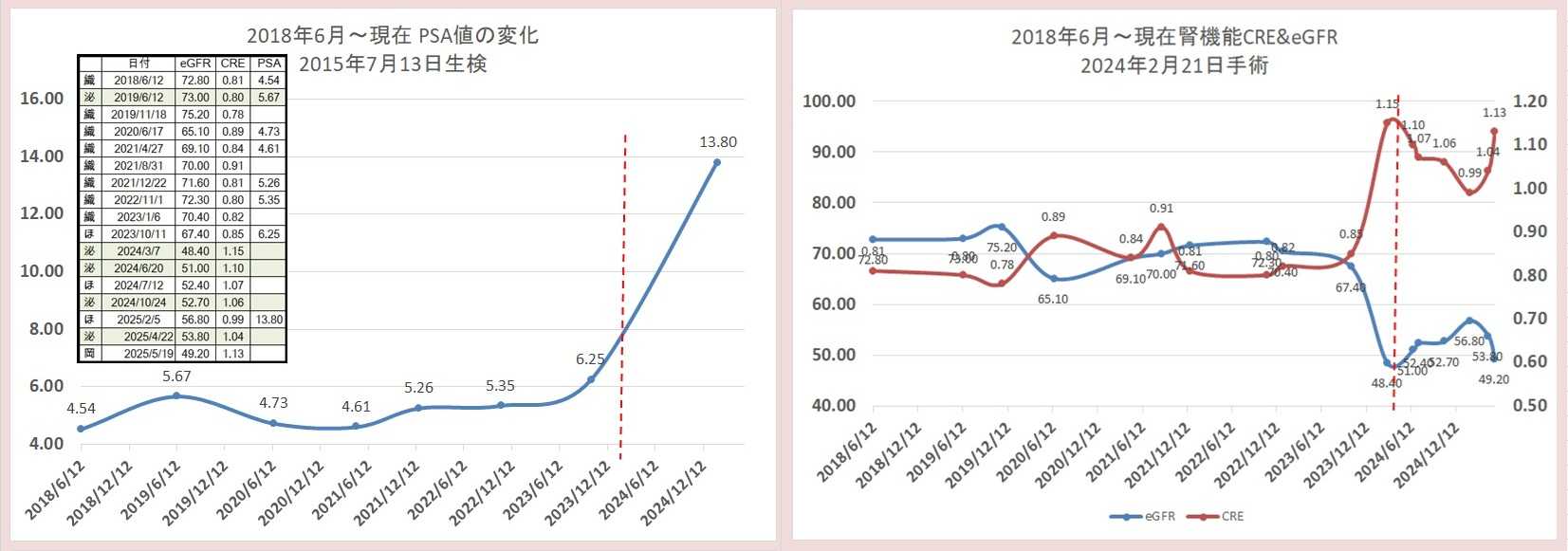 前立腺肥大症! 言われると・・・、おしっこの出が良くないことに気づきますきっかけは掛かり付けの内科クリニックでしたPSA値が4を超えています、泌尿器科で検査を受けてくださいと・・・、MRI造影検査の結果で2015年7月「生検」を受けました経過はこちら泌尿器科で生検、体験してきました。 | katuragi2ndのブログ - 楽天ブログあれから10年になります掛かり付けの内科クリニックでPSA値が13.8あります!!2023年10月 PSA 6.25・・・、PSA値がいきなり13.8になった訳ではないのでしょう2025年4月22日PSA13.8のデーターを持って泌尿器科受診、即CT造影検査の結果、25日紹介状を持ってMRI造影検査を受けました5月13日泌尿器科ではMRI画像を見ながら生検しましょうと・・・したくない!6月6日(金)1泊2日の予定で生検を受けました、全身麻酔で検査が終わって目覚めたとき聞かされた・・・、検査中にゲロして肺に入ったので気管挿管を行いました、胸部レントゲンの結果左肺に異物があるので明日の退院はできません・・・と、抗生物質を投与経過が良ければ月曜日以降の退院になります翌朝もレントゲンとCT検査でやっぱりありますねここに、安静にしてください・・・、結局3泊4日で退院、結果は7月1日に説明しますご家族と一緒に来てください、6月20日退院後2週間で血尿も収まり結果待ちの状態です余計なことが2023年11月泌尿器科で前立腺の年1度のエコー検査中に、右腎臓に2cmのなにかあります・・・腫瘍です良性か悪性化は見てみなければ分かりません手術しましょう、医師は言います「取って見て良性だったら良かったね!、悪性だったら取って本当に良かったね・・・!、どっちにしても良かったね」まるで漫談みたいな口調で手術をすすめるのです私は断ったのですが妻も子供も許してくれません、それは取った方が安心だねと手術をすすめられました、絶対こうなるのです「だから検査は受けないの」と私の妻は言いますこれを手術して取ったのが2024年2月21日でした、腎臓の機能を示す数値は術後1年回復するようにみえたのですが最近手術直後より悪化しています・・・グラフ右側そもそも泌尿器科には前立腺肥大で通院していたのです、腎臓の腫瘍が見つかって私の前立腺はまったく忘れてしまったのです・・・・ここから記事の最初に戻ります。7月1日追記保護者と泌尿器科に検査結果を聞きに行ってきました、待つこと1時間半・・・、先生 前立腺を模した絵に印が書いてあります、15箇所刺して検体を検査した結果ガンはありませんでしたと、良かった!ただ安心はできませんこれから様子見になります、定期的にPSAの検査と前立腺の造影検査をしましょうねと、10月28日検査を予約して帰りに、高級焼酎?・・・を購入、八鹿酒造 銀座のすずめ 琥珀 25%でささやかにお祝いをしました、そして嘘みたいに元気になれました。