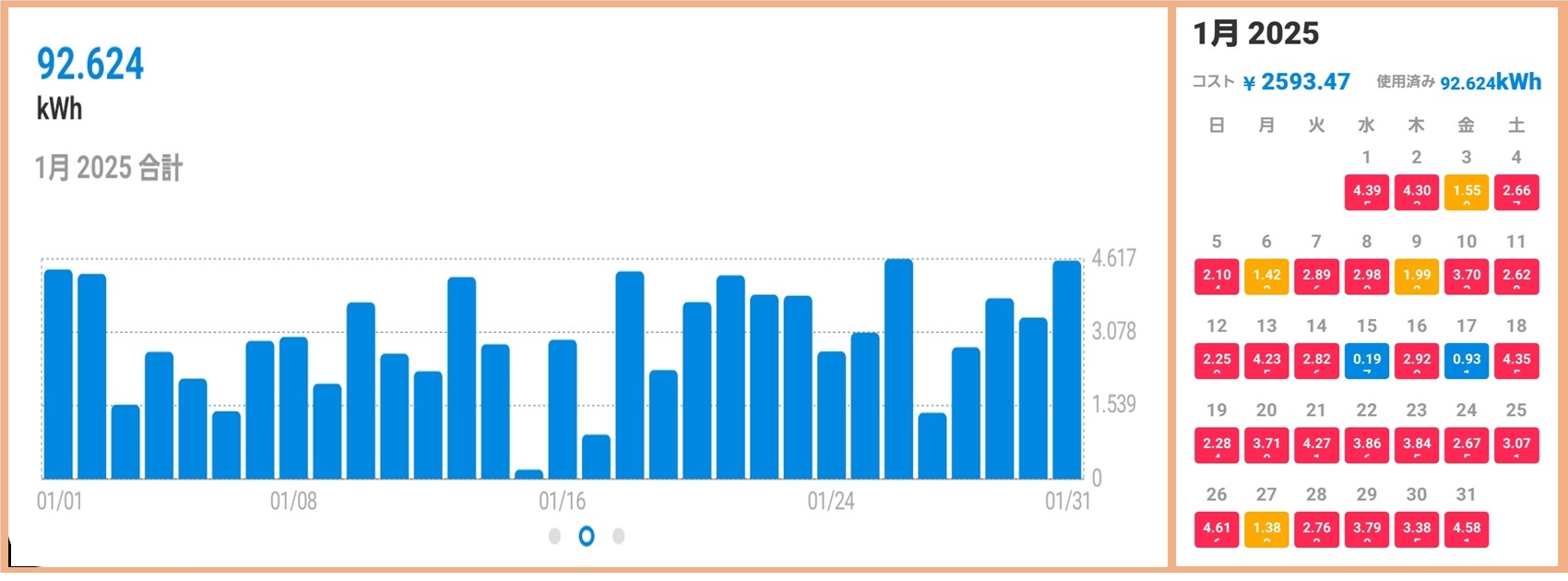 2025年1月のソーラー発電実績です今月は92.6Khw発電量が1kwhを切ったのは2日だけでした日照時間と発電量ですソーラー発電月別集計発電量は前年1月と同等でした夏熱くて秋に日照不足まだまだ野菜の値上がりは続いています今回はエコキュートのお話です(お湯の使用は300㍑/日)エコキュートの使用電力は年間1,300kwh、最近の深夜電力料金は15円/kwh前後ですが再エネ賦課金・燃料費調整額などもあり、20円で計算しますと年間の給湯費は26,000円になりました石油ボイラーをやめてオール電化にしたのは2004年でしたそのころの記録があり、深夜電力は7円/kwh、電気温水器の年間使用電力はなんと4,500kwh・その電気代は31,500円これは安かったです2009年の記録を見ますとちょっと驚き!今と同じ夫婦2人の世帯でした 1年間の使用電力:11,755kwh・電気代 153,831円 温水器の使用電力: 4,303kwh・電気代 34,504円(深夜電力8円) ※石油ストーブも使っていました2024年は節電と省エネ化が進み同じ夫婦2人の世帯です 1年間の使用電力:4,990kwh・電気代 127,666円 エコキュート電力:1,308kwh・電気代 26,160円(深夜電力20円) ※暖房はエアコンのみです電気代の値上げに負けず15年前よりも少ない電気代で、より温かく涼しい生活ができています、建物の断熱・照明のLED化・エアコン・テレビなど長時間使用する電気製品の性能アップなど、エコキュートの導入も大きな要因でしょう。2007年~2024年電気代「単価」の変動&使用量・電気代我が家の電力使用量と支払った電気代から単価を計算しました・・・、18年で15万kwh・254万円注:深夜電力契約ですから夜間の使用が増えれば単価は下がります、2019年からは年間600~800kwh程度のソーラー発電がありますが単価には影響しないようです。