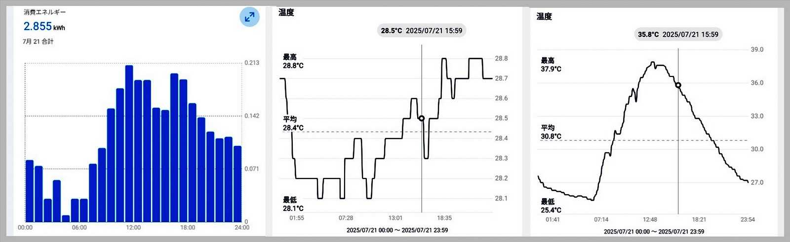 こんな記事がありましたエアコンの電気代は?こんなふうに説明されたら使うの考えますねエアコンを24時間動かすと1ヶ月の電気代はいくら?ダイキンのスタンダードクラスのエアコン「Eシリーズ」を例にとると、6畳用のエアコンの冷房作動時の消費電力は通常「580ワット」です。消費電力が580ワットの状態で24時間、30日(1ヶ月)ずっとつけっぱなしにした場合の電気代は、以下のとおりです。 580ワット÷1000×24時間×30日×31円=1万2945円上記の条件では、エアコンだけで月に約1万3000円の電気代がかかっている計算になります。冷蔵庫や洗濯機などの家電や照明の消費電力を合わせれば、月に2万円以上の電気代になることは十分に考えられます。エアコンの電気代は簡単に計算できませんね、外気温・部屋の断熱・平屋・鉄筋ビル・・・・我家の状況です、家は築8年、窓はペアガラスで少しだけ断熱材追加、18畳の居間の話です2025年7月21日のエアコン使用電力・室温・外気温の記録です地元の気象台の記録では最高気温35.3℃最低気温25.4℃でしたグラフ左は18畳の居間のエアコン2台分の使用電力です7月21日は2.86kwhでしたグラフ中は居間の室温の変化です最高28.8℃・平均28.4℃最低28.1℃、グラフでは大きく変動しているように見えますが温度変化はわずか0.7℃ですから部屋の温度はすごく安定していますグラフ右はこの日の外気温度の記録、最高37.9℃平均30.8℃最低25.4℃です7月21日のエアコンの1時間毎の電気代です(単価31円で計算)エアコン2台で冷房1日の使用電力は2.86kwh、電気代は88.5円でした0:00~7:00居間には、人がいませんこの7時間エアコンを停止しますと10円の節約が出来そうですが、7:00にエアコンを起動するとき大きな電力を消費します、また0:00の電気代が2.6円になっているのは前日からエアコンは24時間冷房運転を続けているからです、18:00前後に使用電力がアップしているのは夕食の準備の影響でしょう18畳の居間は6月15日から24時間冷房運転中です・・・7月21日までの記録ですエアコンは居間の南北に8年前の三菱重工の6畳用が2台あります6月から7月5日までは南側1台を29℃設定で運転しました、7月5日から7月9日まで南北2台を自動運転してみました、その後は南29℃北30℃に変更しました、7月12日に寒いと言うので南北2台を30℃設定で運転しています、部屋の平均温度は28.5℃前後で安定しています・・・、自動運転はダメでした6月の15日分は26kwhで796円、7月分は21日まで59kwh・1,830円です月末まで残り10日で2,850円で収まると考えています・・・先月の電気代は11,039円今月予想は10,461円となっています冷房!人の感覚は当てになりませんから部屋の温度計を見ながら冷やし過ぎないこと、またエアコンがどれくらい電気を食ってるか知ることも重要です、月末に電気代を見ておどろく!より日々の管理ですね・・・、正確な温度計とエアコンの状態がわかる電力計があるといいですね。スマホで見れる温度計と電力計お勧めはこれです・・・まだまだ暑い日が続きます、エアコン暖房はもっと電気を食います・・・今から準備しておきましょう。