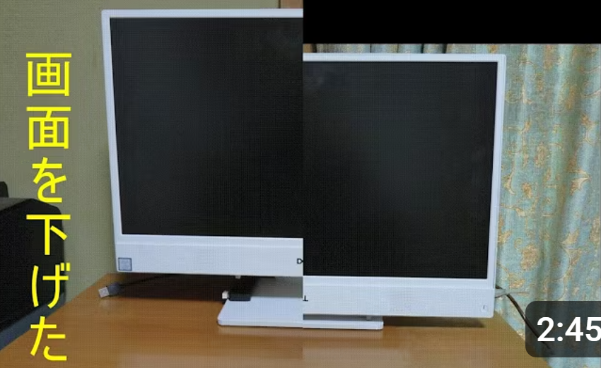 ずーっと!ノートパソコン使っていました、一体型の中古パソコン DELL INSPIRON3280 AIO 8世代を中古で購入しました、画面が大きくて見晴らしが良くなりましたが、困ったことにスタンドがあり画面が高く見上げることになり・・・、すごく首が疲れますネットを調べますとありましたhttps://www.youtube.com/watch?v=wFzBUcyYywcスタンドを外してこんなものを作りましたベニヤ板14cm×17cmにカットして上から15mmの位置中央に穴あけました角材は45mm×70mmを11cmに切り既存のスタンド金具を角材に木ねじで止めますこれをパソコンの定位置に元の4個のビスで固定しますパソコンを立てて画面の角度を調整、位置が決まったら木ねじで止めるのですベニヤ板が回転できるように木ねじ1本で少し斜めに固定しますベニヤ板・角材の見える部分に両面テープで白い紙を貼って誤魔化してあります完成はこんな感じになりました本体下にはゴム足があります隙間は鉛筆が入るくらい、画面の高さは50mmほど下がり見上げることもなくすごく楽になりました。安定感!・・・パソコン本体を後ろ向きに押してみます、倒れません軽いからパソコン本体は後ろに動きます、前に倒してみます垂直を超えたころ話すと多分倒れます・・・、自ら勝手に倒れることはなさそうです。