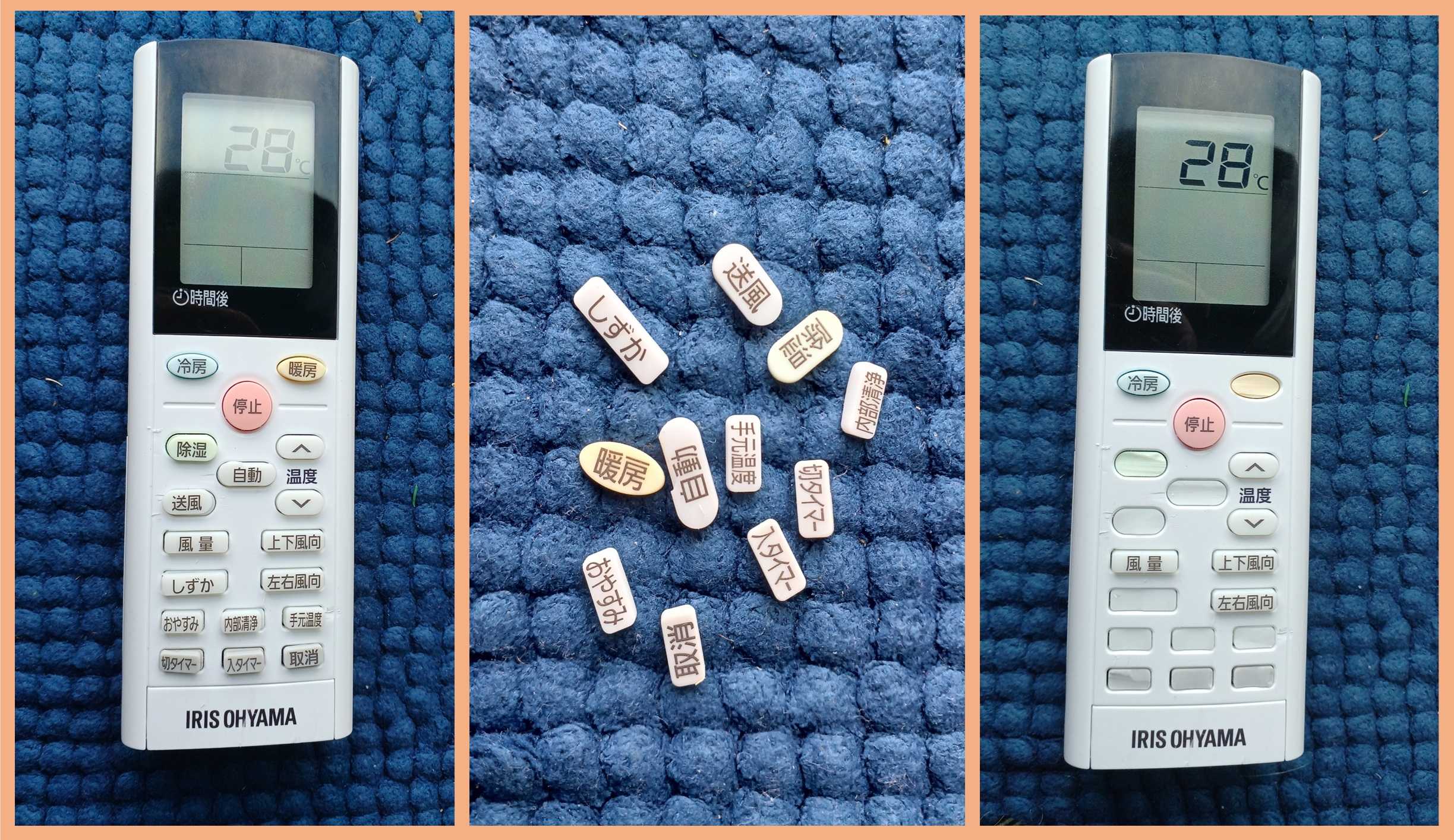 リモコンの改造と言ってもあまり使用しないであろうボタンをカッターナイフで削り取っただけのお話です・・・アイリスオオヤマ IFH-2206G です、多機能?でボタンが18個と多いのです、暗がりで操作しようと、不用意にリモコンを持ちますとピッと音がして何が起きたか?、明かりをつけて確認することになり目醒てしまいます不要なボタンを11個削り取りました寝室エアコンは冷房専用で使用しています、は削り取ったボタンは11個、爪で押せば操作することができます風量・上下風向・左右風向の3つのボタンも自動設定で運転しますので不要かもしれませんもしもの操作のためにボタン配列図をリモコンの裏に貼り付けました以前にも調査しましたが待機電力が5Wh弱あり1日で110Whもあります節電のため10月~5月は分電盤でブレーカーを切ることにしています8ヶ月0.11KWh✕240日=26.4kwh・・・・・28円計算でなんと740w円にもなります6月21日この日は最高気温34.2℃、最低気温25.2℃でした寝る頃、寝室の温度は30℃を超えていました28℃設定で22:00~06:00運転使用電力は0.5kwh程度でした。
