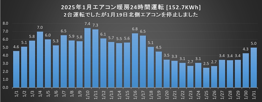 2025年1月のエアコン暖房運転の状況ですエアコン2台で運転していたのですが、北側のエアコン気温が低いと凍結し霜取り運転をしていることが分かりました、1月19日に停止して南側の設定温度を20℃⇒21℃に変更しました、その後の消費電力は減少しているようですが、外気温のグラフを見ると結構温かい日が続いたようですエアコンの消費電力1月分は152.7kwhでした1月分の電気料金単価は国の補助もあり昼間・深夜・休日・再エネ賦課金も含め26円になりました1月の暖房費用は・・・26円/kwh×153kwh×=3,980円になりましたリビングの温度記録です平均室温は22℃で安定しています、記録は1分間隔ですから最高と最低室温は一寸だけその温度になったとの記録です、最低気温は部屋の掃除・換気などでも急激に下がります地域の気象台の記録です氷点下を記録した日が数日ありますが下旬は温かい日が続きました去年の暖房運転との比較をするために資料を見てみましょうエアコン暖房24時間運転 (完) | katuragi2ndのブログ - 楽天ブログ去年の冬と今年の冬平均気温を比べてみました青いのが去年、黄色いのは今年です今年の方が寒そうです床下・居間寝室・天井床下・外気洗面・和室 Switchbot 温度計スマホのスクリーンショットです1月16日 07:28 外気温は-0.7℃まで下がりました・床下は13℃~14℃で安定しています11ヵ所の通気口は昨年から塞いであります・居間22.0℃天井の年末に施工した断熱材の2重施工の効果が出ているようです・寝室13.8℃この日は寒かったです大きな掃き出し窓と枕元に窓があります・天井6.6℃密閉されていない軒天有孔ボードから冷気が吹き込むのでしょう・洗面22.9℃この日は深夜から脱衣所のエアコンで洗濯物の乾燥をしました居間から漏れ出る暖気があります2月2日 9:00これを書いてるころの温度、和室との仕切りは木製フスマ3枚あります居間側の表面温度22℃・和室側18℃ 室温は15℃です、玄関はガラス戸1枚居間側22℃・玄関側18℃で玄関は14℃でした、我が家で一番の暖気漏れは北側の勝手口でしょう、付近の壁は21℃ありますがガラス面は18℃外側はほぼ外気温です、ここにプラダンを張って多少効果を感じたのですが・・・、見た目が良くないから外すように指示がありました。