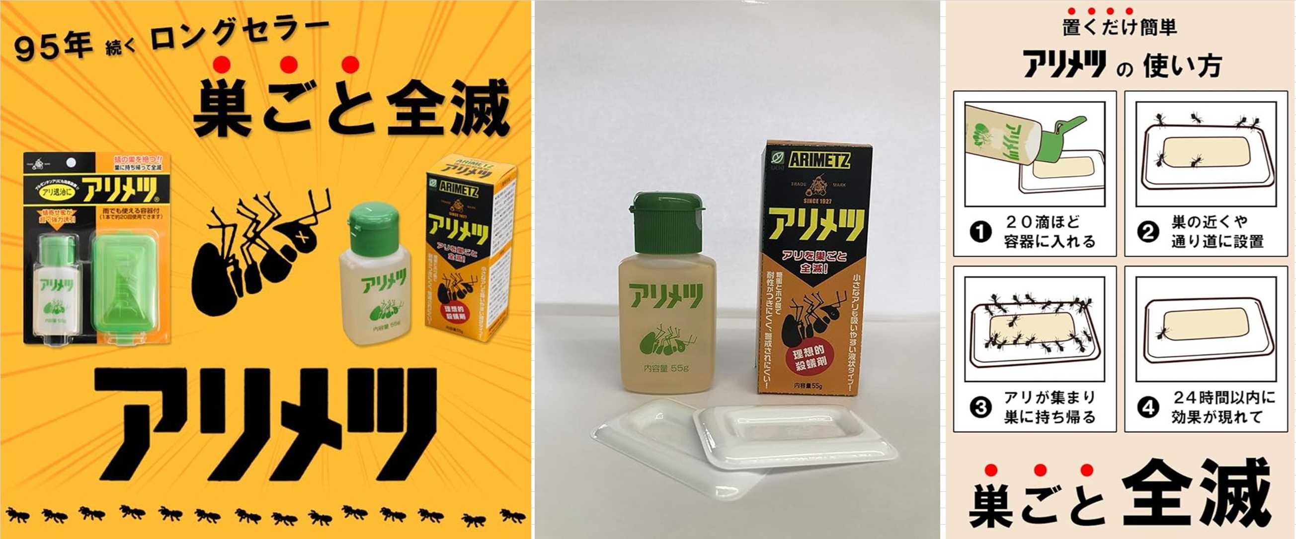 食卓の端でパソコン生活です、時折手足がチクーっと痛いです見ますと小さい蟻が食いついています、小さい蟻ですから食いつくまで分かりません、なぜ食いつくのかも?キッチンでも見かけます、キュウリ・ナス・ピーマンなど収穫したときに付いてくるのかもしれません古いアリの巣コロリがありますので置いてみますが反応がありませんアマゾンでアリメツを購入し床と食卓に置いてみましたがヤッパリ反応ありません思えば最近蟻!いなくなったみたいです・・・ところが1週前くらいから窓際に置いた古い整理タンスにあるティシュペーパーに蟻が居ると言います、放っておいたのですが丸めたティッシュをもってきて開けて見なさい・・・、居ますたくさんの蟻整理タンスの下にアリメツを置いてみました30分もしますとこのように!タンス付近を観察しますが、周りの床に蟻の道はなさそうですしばらく観察しますと判りました、タンスの飾り枠の右端から出入りしています巣はこの中だ!多くの蟻はこの上を歩きます、ここにアリメツの皿を2個ティッシュでこよりを作りアリメツをしみこませ置きます2時間も過ぎたころ蟻が減ってきました、説明書を見ますと4時間もすれば薬が効き始めると、6時間過ぎたころ動いている蟻は見当たりません、みな家に帰ったのでしょう倉庫にも同じ蟻がたくさん住んでいます文庫本の棚を倉庫の壁に貼り付けてあるのですが、もう8年前倉庫ができた直後からこの棚に住んでいるようです、たくさん居たのですが2日もすると動いているものはいません、新たにごちそうアリメツを置いてみましたが来ません全滅!した模様です。アリメツ|アリを巣ごと全滅