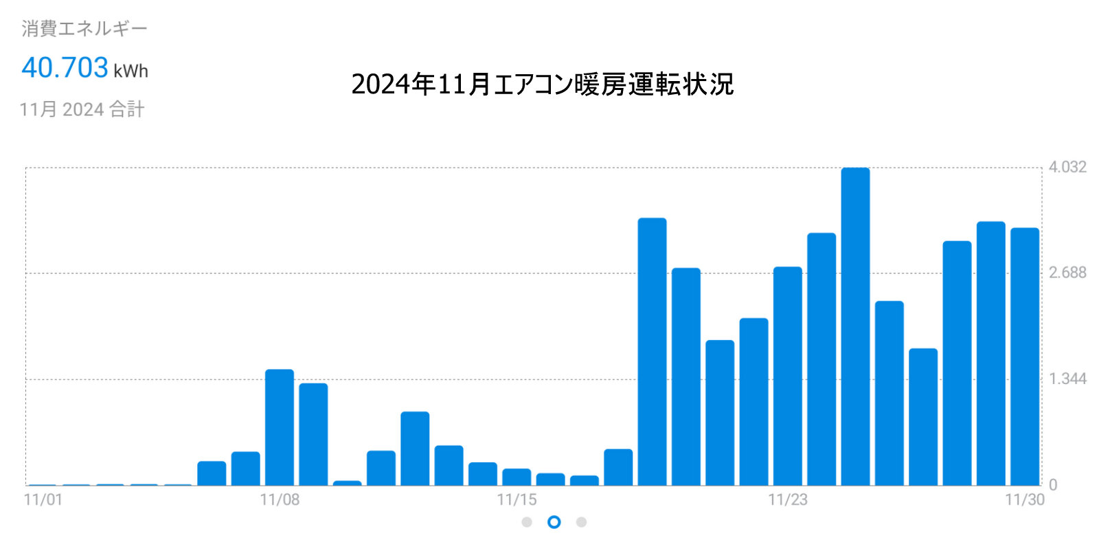 この秋!電気代は30円/kwh前後で推移しています、この冬エアコン暖房費が心配ですが、エアコンの24時間暖房運転は始まっています設定温度は21℃風量は自動にしてあります上旬は温かくあまりエアコンは起動していません、11月分のエアコン消費電力は40.7kwh電気代は30円/Kwhで計算すると1,220円になりますちょっと寒かった11月25日の消費電力は4Kwhになっています120円/日ですエアコンの消費電力量はTapo C110P スマートプラグのデーターです運転中のエアコン11月1日~5日は温かく起動しなかったようですこの時の待機電力は0.017kwh/日でした0.5円/日になります、エアコンは温度設定して運転すれば起動しない時の電気代は気にしなくてよさそうです11月の外気温・室温データー時間平均値ですエアコンは10月末から24時間暖房運転中です2024年12月9日は午前6:30ごろ今季最低気温2.8℃を記録しました、この日のエアコン消費電力は5.57Kwh電気代は167円になります12月9日エアコン暖房24時間のデーター 最大0.51Kwh12月9日の外気温と室温のデーターエアコンは18畳のリビングに2台あります1台運転と2台運転を比べてみますと2台運転の方が、部屋全体の温度が安定する分、電気代は少しだけ高くなるようです、せっかくの暖房ですから快適性を追求しますと10%の電気代アップは我慢できる範囲でしょう。前季のエアコン暖房運転費用です2023年12月~2024年03月暖房費用があまりにも安いので検証してみました、購入した電力は4ヶ月分で 2,100kwh 電気代は47,150円でした、単価は 22.5円/Kwhだったのです、九州であること政府の補助があったからでしょう4ヶ月の暖房費用は 524kwh 11,800円 でした、これを1缶 1,900円の灯油価格に換算して 6.2缶になり知り合いと話した、結果は起きているときだけのファンヒーターの灯油代でもっと多いとの話でした。