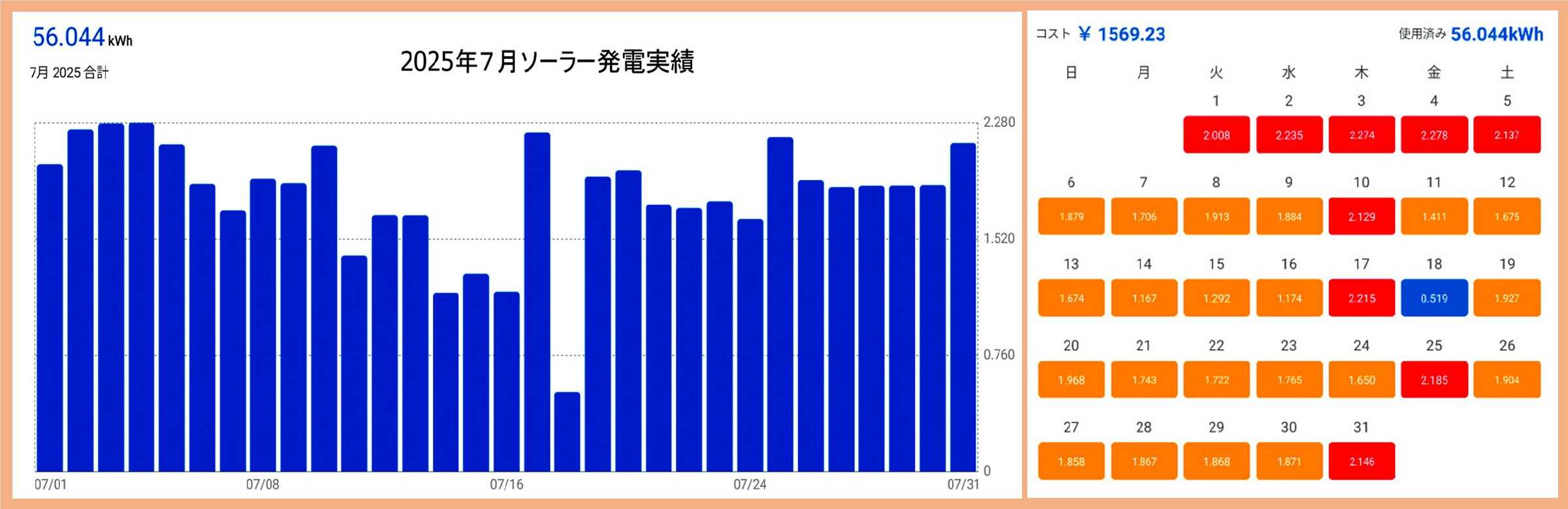 2025年7月のソーラー発電実績です2025年6月27日福岡管区気象台は大分県を含む九州北部が梅雨明けしたとみられると発表しました、統計開始以降、最も早く梅雨明けしたとみられるとのことで、6月中の梅雨明けは異例の早さです、大分県は6月8日に梅雨入りし、梅雨入り自体は平年より4日遅く、去年より9日早い梅雨入りでした。私の知ってる梅雨明時期は子供たちが夏休みになる7月20日頃だったと記憶しています7月の発電量は56kwhでした7月たくさん雨が降ったのは7月18日だけでした7月は日照時間過去最高でしたが発電量は例年並みでした7月16日夕方発電量の異常に気付きました7月15日に気づいたのですが発電所のインバータの温度が50℃を超えていました、暑いから・・・と、考えていたのですが16日も同じ感じでした、夕方ロガーの記録を見ますと何回も発電停止していることが分かり発電所の接続など確認しているときファンの停止に気づいたのです、17日早朝右側のファンを予備品に交換しましたインバーターは2016年から運転中です、過負荷で発熱し保護機能が働いたものでしょう、壊れなかったのは幸いでしたインバーター本体のファンは故障し撤去現在は、収納BOXの側面に左側に吸気、右側に排気、12V8cmファンを直列に接続してあります、発電しない夜間は停止します、今回は右側のファンの断線で両方停止しました、前回ファン交換は2023年3月5日左側、同種のファン予備が3個あり安心しました。