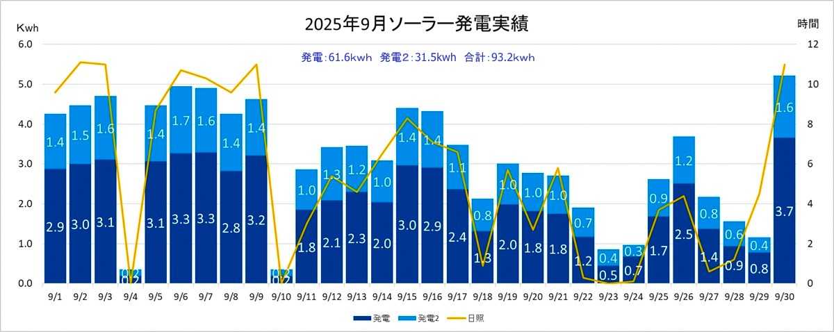 2025年9月のソーラー発電実績です既存の発電所は南側のブロック塀に目隠しフェンスとして垂直に設置した250w8枚のパネルです、夏エアコンをフル稼働するころには太陽高度が高く発電量は減少します、不足分を補うために8月末に北側倉庫の屋根に275w2枚のソーラーパネルを空に向けて設置しました(発電2)グラフ既存の上に水色が発電2の実績です5割増しになりました過去の実績です6月は梅雨 7.8月の5割増しを期待しています太陽高度は冬至33度~夏至78度、季節ごとのシミュレーションです倉庫のソーラーパネルは太陽高度が下がる冬至の前後90日間は母屋の影になり発電は見込めません、ブロック塀のパネルはこの時期発電量は最高を記録します9月30日の発電記録です・・・、発電時間は短いのです西側に山!ブロック塀の発電は14:45終了、倉庫は14:00過ぎには発電終了しています、状況から冬には倉庫の発電は期待できそうにありません・・・。