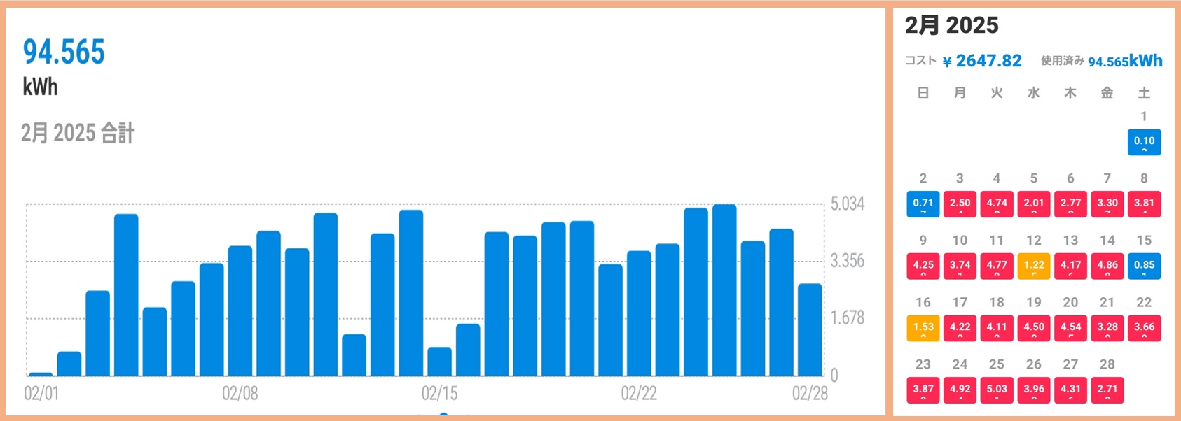 2025年2月のソーラー発電実績です2月は94.6kwhでしたソーラー発電量と日照時間過去の発電量と日照時間2月の購入電力量は571kwhでした平均18.4Kwh/日になります気温の影響を受けるエコキュート・エアコンと、その他に分けてグラフにしました2月の最低気温です暖かくなりますとエアコンは不用になり、水温が上がりエコキュートの消費電力も減少します、2/28の購入電力は12.1kwh・・・、春になれば日々の購入電力はもっと少なくなるでしょう。