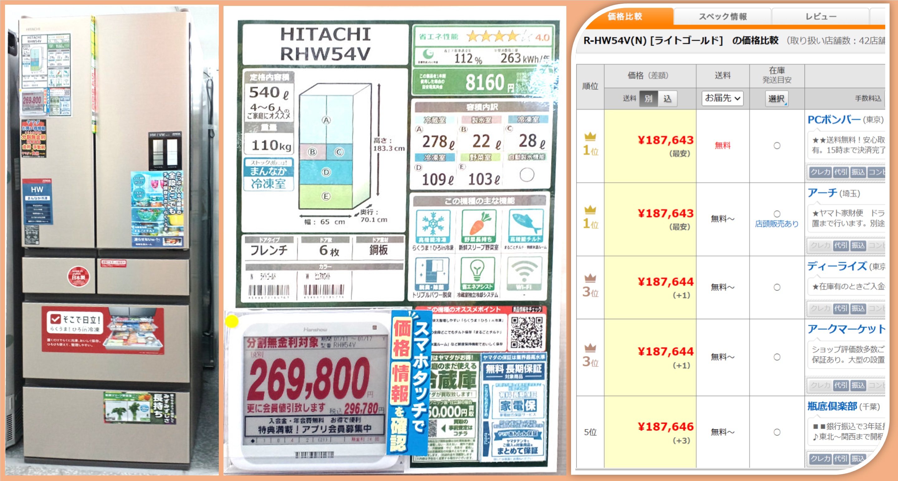 購入14年を過ぎた冷蔵庫まだちゃんと冷えるのですが夜中に大きな音がする、冷凍庫は多量の霜がつきアイスクリームが別物になってしまう、匂いが取れないなどなど・・・買い替えが決まりました2025年1月18日搬入されました5年保証を付けて引取りリサイクルなど含めて24万円の支払いでしたネットで購入すれば18万円長期保証引取りリサイクルなど含めても数万安いかも知れませんが、壊れたらまた買い替えるにはちょっと高い!安心できる地元で購入となりました新旧の仕様を並べてみます容量520㍑⇒540㍑少しだけアップ・消費電力290kwh/年⇒263kwh/年・寸法ほぼ同じでした据え付け4日目の消費電力です0.81kwh/日平均消費電力は33.75whになりました、ピークの165wは毎日一回の霜取りです電気代は 0.81kwh×365日=296kwh 28円/kwhとして8,300円/年 夏はアップでも1万円弱です 設置完了しました右側、左は古い方です右は分別ごみ箱です青い部分を透明の荷造りテープで冷凍室まで巻き込んで張り付けてあります、向こう側は勝手口の扉の枠に持たれています、それだけでしっかり固定できています古い冷蔵庫の消費電力を調べた記録がありました、新しいのが少しだけ省エネかな?冷蔵庫の消費電力・電気代を調べました | katuragi2ndのブログ - 楽天ブログ奥様のテレビ65インチが一日中点いているのですが、この消費電力が1.3kwh/日になります、※ ※ ※ 冷蔵庫の消費電力はテレビより少ないのです。※ ※ ※