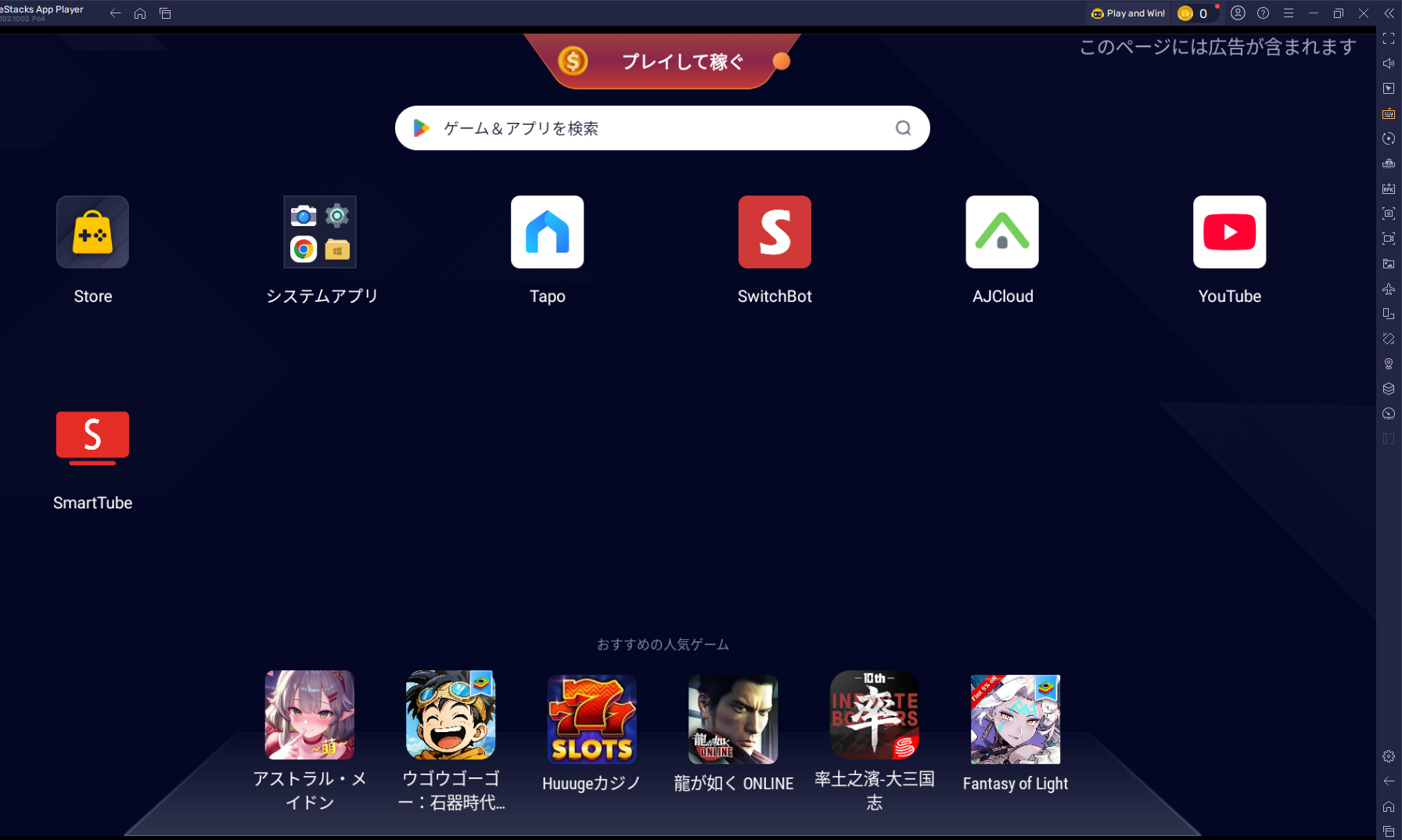 パソコンでゲームはしませんがBlueStacksを使っていますAndroid エミュレーターでTapoLink・SwitchBot・Ajcloud・Youtubeアプリが動きますTapoLinkの電力計測と監視カメラ画像はパソコン画面いっぱいに表示できますTapoLinkで家庭内16カ所の使用電力を監視していますSwitchBotの温湿度監視室内と床下・屋外の温度湿度を監視していますAjCloudの監視カメラです夜は星が見えます3台の監視カメラ録画された画像を拡大表示できますYoutubeを見ながら電力・温湿度・監視カメラも切り替えて見れますSmartTubeをインストールすると中断なく延々と鑑賞できますパソコンの状況・・・2コア4スレッドですピークはスクリーンショットを行いました、メモリーは16GBあった方がよさそうです。