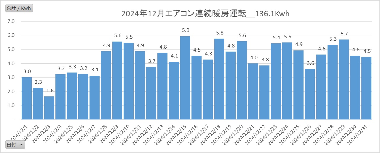 18畳の居間エアコン24時間暖房運転中です、壁・ドア・天井を通じて抜ける暖気もあるようで両隣の部屋・廊下なども15℃程度をキープできてるようです、12月末に居室のみの天井の断熱材を、玄関・廊下・風呂・脱衣などにも2重に敷き詰めました、この効果はどうか、1月分の暖房費が気になります12月エアコンの使用電力は136Kwh(単価28円)3,800円になりました1日分のエアコン使用電力はこんな感じで5.6Kwh(157円)でした12月の居間の温度と外気温の変化(12/30 6⃣時間停止)連続運転してきたエアコンを12月30日就寝時に6時間だけ停止してみました12月30日 0時に停止して6時間後に起動しました、起動時に大きな電力を使用しています、停止後の使用電力を前日と比べてみます 12月29日 12時間(枠内)3.5Kwh 24時間(1日分)5.7Kwh 平均気温 7.3℃ 12月30日 12時間(枠内)2.5kwh 24時間(1日分)4.6kwh 平均気温 7.8℃記録から就寝時にエアコンを停止した12月30日の方が使用電力は 1kwh 少なかった、エアコンは起動時に大きな電力を使用するが、長時間必要ない時は停止した方が電気代は安くなるのです結論です・・・、6時間停止して節約できた電力は1Kwh です朝起きて室温は16℃部屋全体が暖かくなるまで1時間は寒いわけです、ヒートショック!健康にもよくなさそうです、 深夜電力20円×30日=600円で健康的で幸せな朝が始まるのです・・・、やっぱり!エアコンは止めない方がよさそうです。