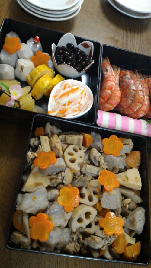 あけましておめでとうございます(^O^)/ 去年は無事にみんなが健康ですごせたことが何よりです。 さて、またまた簡単なおせちですが作りました。 毎年定番ばかり、来年こそは変わったメニューを増やしたい。 30日まで仕事だったので 31日に掃除しながらなので本当に簡単なものばかり エビでかなり場所取りしました! 甘辛く煮ました 数の子 塩抜き2回して軽くだしじょうゆにつけました たまご 我が家は伊達巻が嫌いなので普通の卵焼き! 田作り みりんとしようゆをグツグツさせて乾煎りしたごまめをいれてからめ、白ごまを振りました。みりん多めが好きです。 黒豆! さびた鉄釘を入れると綺麗な色に仕上がるのですが毎年探すけど無い。釘入れたけど色は茶色っぽい。錆びてないからかな? 一晩黒豆の6倍の水につけときます。 その後くろまめと同量の砂糖を入れてアク抜きしながらグツグツ3時間 豆が空気に触れると良くないので落し蓋をしてその上に蓋をします。 最後にしようゆ、みりん大さじ2ずつ入れてみた 今年は黒豆2袋使ったけど、すでになくなりました。2日めが味か馴染んで美味しいのにその頃には少ししかない なます だいこん、人参を甘酢て 柚子皮ちらしてみた さつまいもきんとん さつまいもを蒸して潰した。甘かったので味付けなし 昆布巻き こぶを戻して、酒を振った甘塩鮭を戻したかんぴょうで巻き甘辛く煮た。 れんこん酢漬け ちょっと砂糖少なめ酸っぱ目の酢で軽くゆでたれんこんをつけてみた。 唐辛子入れるの忘れた! 筑前煮 さやえんどうがなくて代わりに枝豆で色付け😊 と簡単なものばかりでしたが量はそれぞれかなり多い でも2日の朝にはなくなりました。 にほんブログ村 にほんブログ村 にほんブログ村 にほんブログ村 みみりん助産師の妊娠出産おっぱい育児入門