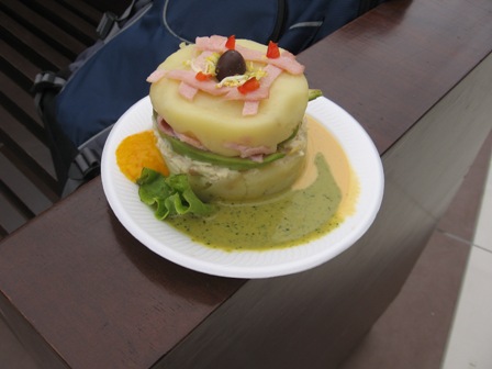 エストイ カンサード・・・・疲れたっていう意味です。勤務先の作業員とはクチパクで伝わるようになりました。みんな疲れてるんですね。オイラは夕方からの勤務だからいいけど、作業員たちは朝の8時集合で夜中の12時過ぎまでほぼ立ちっぱなしで働いているのです。仕事が終わると楽しいそうな顔で帰宅してますが、相当疲れているはずです。そして安月給・・・。そんな彼らに無駄な指示ばかり出している会社の責任者に腹が立ちます(怒)。一昨日、会社の責任者に対して厳しく指導したのですが、そんな簡単に良くはならないか。昨日は二つの事件が起きました。きょうはどんな事件が起きるのか不安です・・・・。体調は少しよくなりました。喉の痛みはないのですが、咳が出ます。食欲もありません・・・というよりは、味付けが濃く、ライスが山盛りで出てくるペルーの料理に飽きたのかもしれません。最近できたスーパーの中にあるファーストフード店でこんなのを見つけました。ケーキではありません。商品名は不明・・・・。5ソル(およそ150円)。上下はマッシュポテト、中にはハム、アボカド、ツナなどが入っています。要するに、パンをマッシュポテトに替えたサンドイッチみたいなものです。実はず~っとケーキ屋だとばかり思っていました。(確かにケーキも置いてありますが・・・。)あっさり味で量も多くないので、今のオイラにはちょうどよかったです。スーパーからの帰り道です。なぜか18秒で渡らなければならない信号を渡って・・・・マラクージャ(パッションフルーツ)のフーゴ(ジュース)を飲みました。50センチモ(およそ15円)です。おばちゃんが、決してキレイとはいえない手とカップで、果肉の沈んだジュースをかき混ぜて入れてくれました(笑)。おいしかったです。さて、仕事に行く準備をします。きょうは何事も起こりませんよ~に!