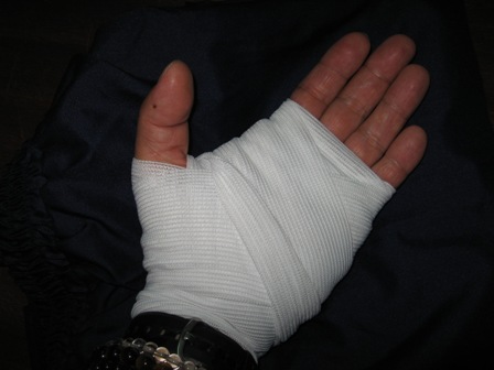 昨日から通常勤務で身体は楽になりましたが、勤務先ではいろいろと揉め事があります。きょうも「なんだかなあ・・・」って感じで。ホテルに戻ってからも状況報告をしなければならないような話ばかりで・・・・。それとは別に日記として残しておかなければならないことが起きました。自損です・・・(--;)。ある道具を使って仕事をするのですが、ペルーの同僚(同年齢、男性、老眼)の設置の仕方が悪いので、オイラが確認していたら左手親指つけ根に刺さってしまいました。出血です(汗)その同僚が作業員に通報して、女子社員が消毒液と包帯を持ってきてくれました。5mm以上は刺さったと思いますが、とりあえず止血できたのでよかったです。ちなみに包帯を巻いたのはオイラです(爆)。別室の作業員たちは「どうしたの?」と訊いてくれました。みんないい人です。しかし、正社員たちは知らん顔でした(笑)。こんな会社の担当です・・・。それよりもこの状況を知っていながら、オイラの治療しているところには来ないで、10mほど離れたところにある窓から隣の部屋にいる女子作業員の様子ばかりを観ていた通訳はどうよ?!(怒)治療が終わってから怒ってガッツリ言ってやりました。「人が怪我しているのを知ってるのに向こうばかり観てるのはどうなのよ?通訳は要らないって言うぞ!」と。彼は最近通訳もせず、作業員のおねえちゃんとおしゃべりする時間が多かったのです。肝心なときにそばにいないので、オイラがスペイン語辞書を片手にやりとりしたこともありました。ある意味ちょうどいいタイミングで負傷したのかもしれません(--;)彼は通訳を引き受ける際に同僚たちからクビにならないように注意されたらしいです。それから今朝、移動の車の中で、「(総元締めの)カルロスから、会社に問題はあるが通訳には問題がないと聞いている と言われた」と、自慢げにオイラに話したばかりでした(笑)。オイラに注意されてからしばらく元気がなくなりましたが、午後からは名誉挽回とばかりに率先して何でも通訳するようになりました(笑)。「向こうに行って状況を聞いてきましょうか?」とか・・・。当たり前だろ!ちなみに一日1万円もらっているらしいです。もっと働いてもらおうかな(笑)オイラの正体を知っている日本のみなさんは、怪我のことは内緒でお願いします。上司がうるさいので(笑)今は傷口は塞がり、若干赤くなっていますが、腫れはひどくはありません。プラナリアのような再生能力です(笑)会社の食堂での昼食です。SOPA DE POLLO(鶏のスープ)。おいしいのですが・・・冷房のない食堂でのスープ・・・汗だくです。しかも・・・・こんなのが入っていました。鶏の足です・・・(汗)コラーゲンがいっぱいらしいです。コラーゲンよりは、薄くなってきた髪の毛がほしいな(爆)