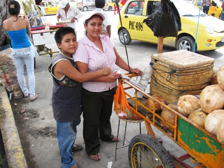 Hoy es Domingo!ということで、ピウラ市のカタカオスという街に行くためにバス乗り場に・・・。すると、バス乗り場の前に偶然にもココヤシジュースの少年がいました。Amigoであるオイラは、もちろん買ってあげました。彼もまた、オイラのために冷たいココヤシを出してくれました。真面目で一生懸命でいいやつです。間違いなく定員オーバーのマイクロバスに乗って、カタカオスに向かいました。オイラは、本当はシートではない席・・・乗客全員と対面する場所に座らせられました。ちなみに料金は1ソル(およそ30円)。この少年はオイラの目と鼻の先に座っていました。べとべとに溶けたアイスを持って・・・(--;)溶けたアイスがオイラの脚に落ちてこないか心配でした。彼は彼で、怪しげな日本人が目の前にいたから嫌だったろうなぁ・・・・。隣の席の少年は終始うつむいたままで、もっと嫌そうでした(^^;)バス乗り場から20分ほどでカタカオスに到着。オイラの宿泊しているホテル周辺とは違って、すっごくキレイな街でした。ここは民芸品店が建ち並ぶ街なのです。こんな感じで・・・・。でも、欲しかったものは見つからず・・・・。とりあえずケーナを買いました。10ソル(およそ300円)でした。ホテルに帰って練習しましたが、うまく吹くことができません(--;)実は今、パソコンにペルーコーラを溢してしまいました(汗)。この右側のやつです。キーボードのF1、F2の辺りとQ、W、Eの辺り・・・・(汗)。キーボードの隙間にティッシュを入れて吸い取ったのですが・・・・(汗)。こうやって動いてるから大丈夫かなぁ(--;)これからエアコンの前で乾燥させます(汗)